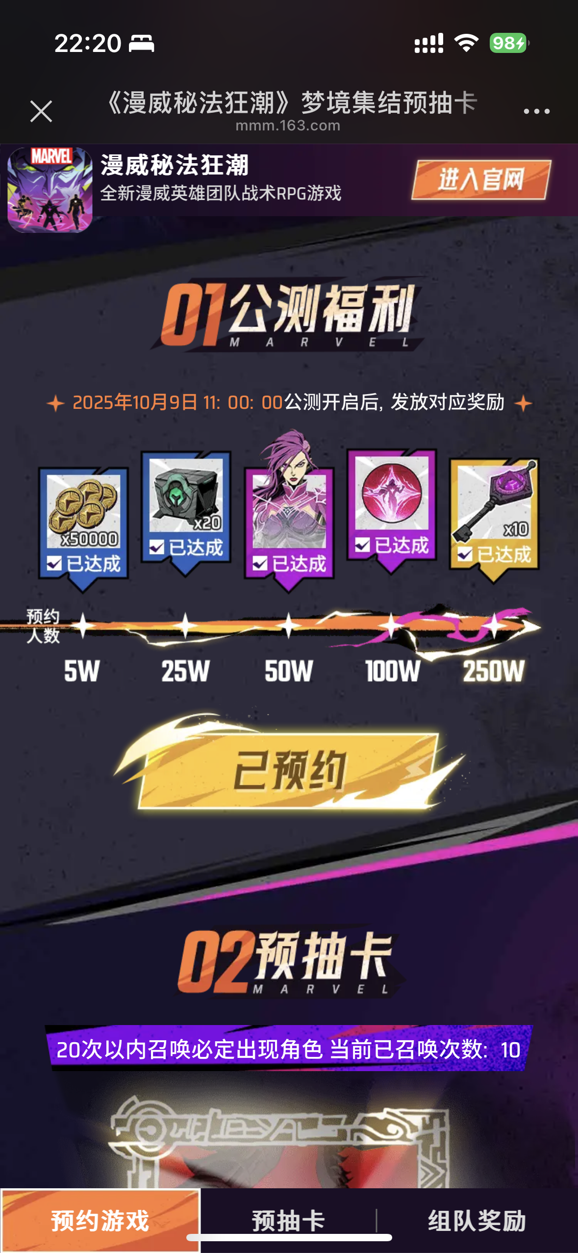 https://mmm.163.com/h5/20251002/bbh/zsbmhqnekupmzneq/?pagekey=21b133a4b59701c2 队伍码:21b133a4b59701c2 #漫威秘法狂潮预约开启