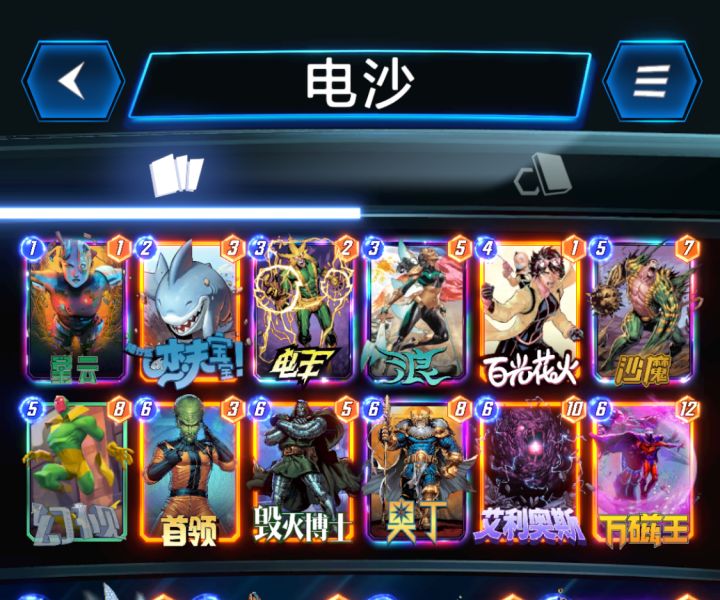 今天推荐个造价稍微有点贵的卡组就是电沙。一套看似卡手实际上很流畅的卡组。刚需的卡有电王,沙魔,浪,百光花火,首领,毁灭博士,奥丁剩下的就是可替换组件,五费可供选择的还有气旋,教授,恶鬼六费可供选择的不多,实在没得选浩克大哥也是一个选择吧鲨鱼可以换成美杜莎或蜥蜴,星云可以换成黑舌,不过就很吃操作了。简单来说就是这套构筑中至少有四张六费。电沙系统主要就是依赖电王和浪的跳费能力打出压制效