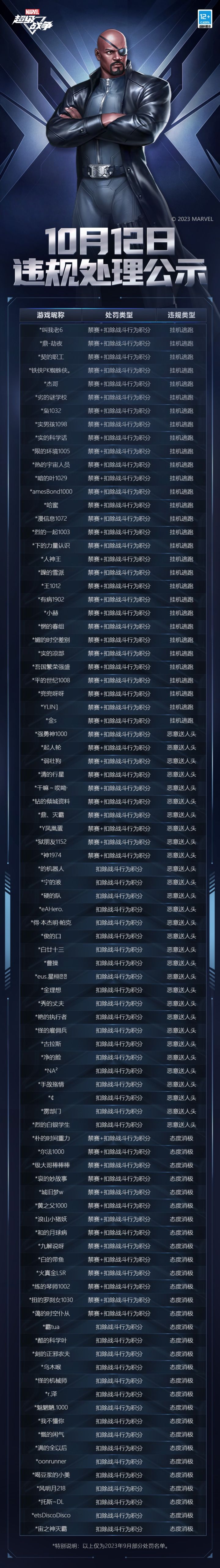 10赛季已开启一段时日!为了维护游戏环境,神盾局特工持续重拳出击!针对在对局中恶意送人头、挂机、态度消极等行为,根据其情节严重性采取禁赛、禁言、扣除战斗行为积分等惩罚,以下为2023年9月部分处罚名单公示,欢迎观察者们共同监督。 如您在游戏中发现任何违规行为,欢迎通过[设置]-[客服中心]举报反馈,我们将在信息审查核实后予以处理。感谢各位观察者的支持!#游戏种草计划#漫威超级战争S10赛季#漫威超级战争三周年