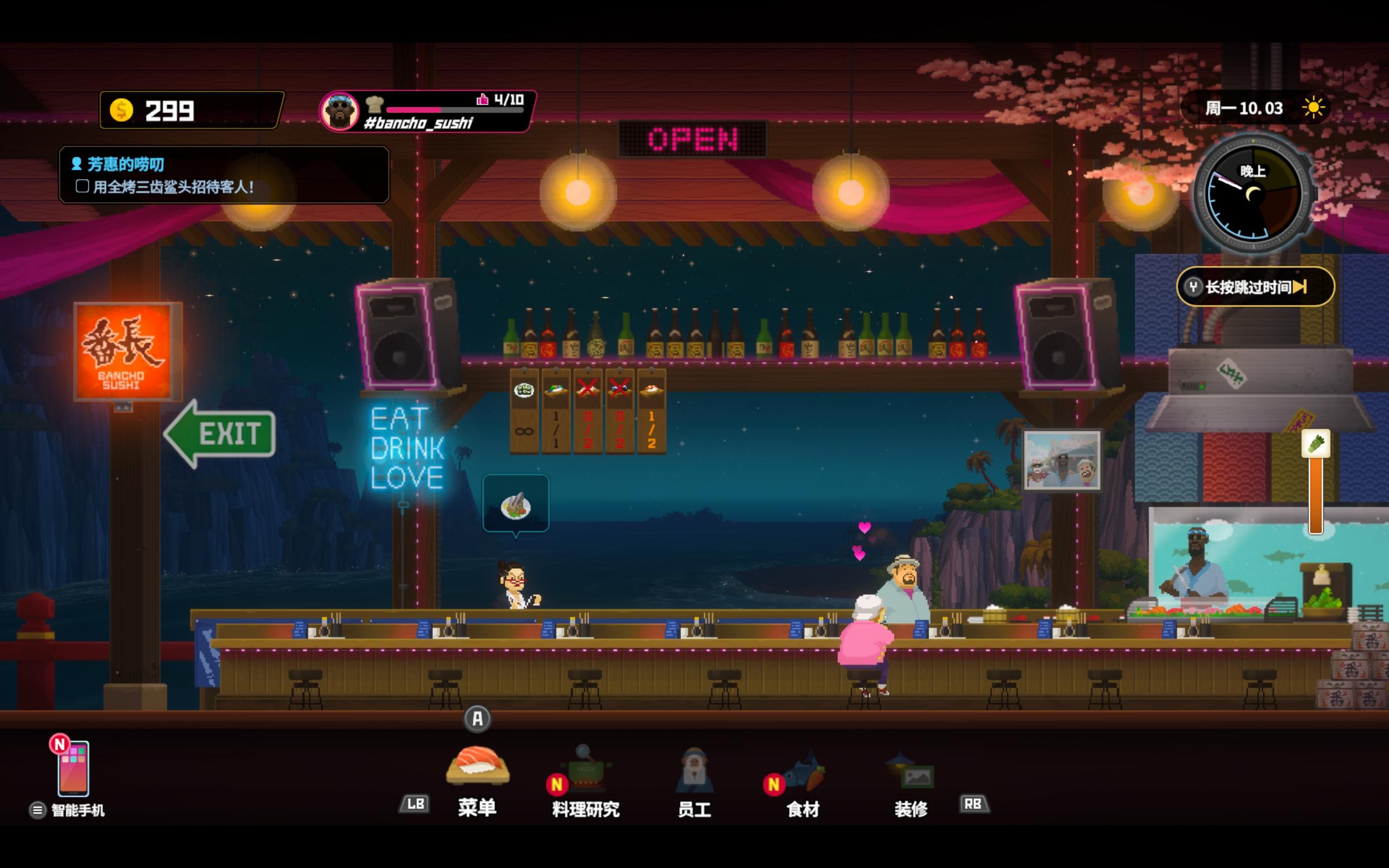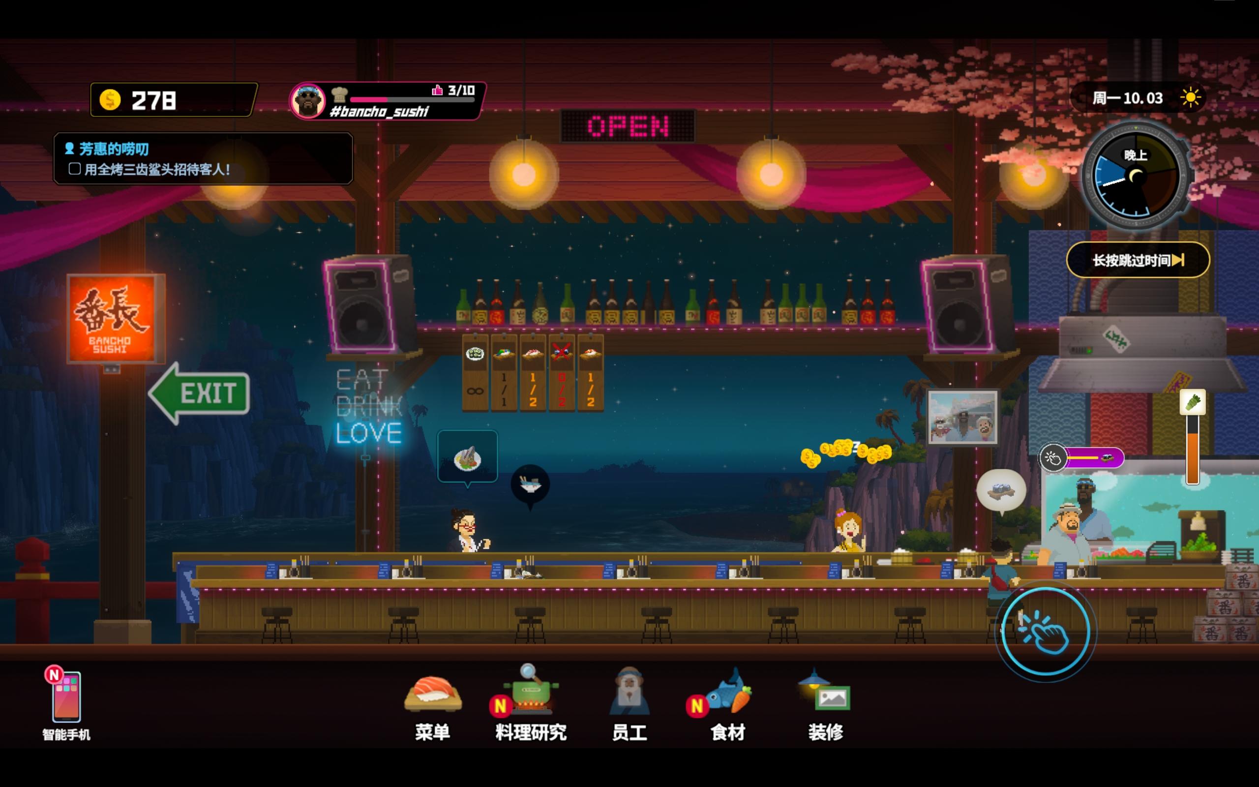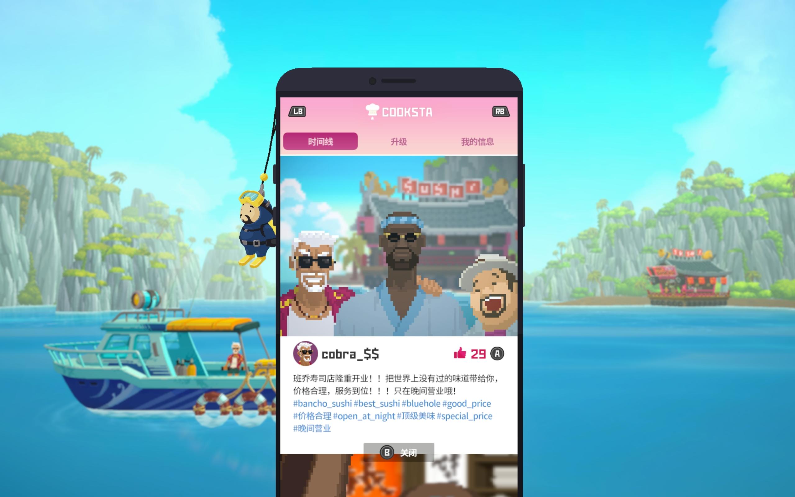 先说说让我直接上头的点:1. 电子榨菜,名不虚传:白天抓鱼晚上开店,这节奏太有毒了!一玩就停不下来,完美适配我这种注意力碎片化的人。2. 手机独享的惊喜:那个竖屏的餐厅评价APP(Cooksta) !绝了!真的就像在刷大众点评,沉浸感拉满,这点PC都没有,手机党赢了一局。(就是论坛界面太简陋了,甚至感觉不如晋江文学城的论坛。)但是!我要开始吐槽了!血压升高部分:1. “长按下海”是哪个天才