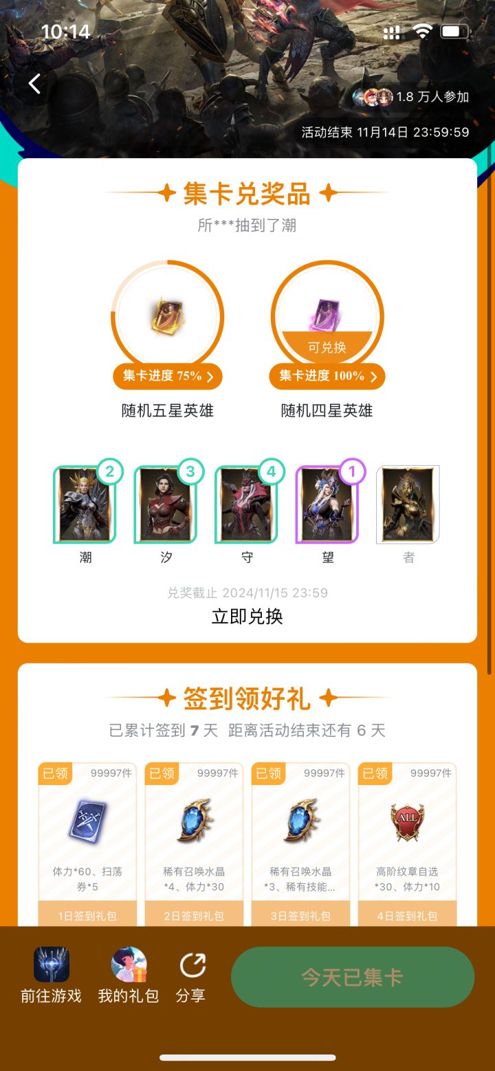 07-3J-TH-26-TD互绑领哈苏皮肤啦兄弟们,67级,奖励一次就能领完,拿去抽猴子不香吗 #潮汐守望者 #潮汐守望者兑换码 #潮汐守望者推荐阵容 #潮汐守望者新手长久玩的互绑谢谢