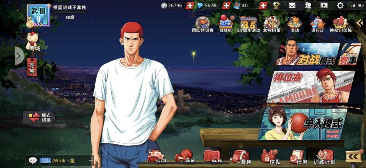 首款横版篮球RPG页游,采用全新横版RPG游戏模式,创新可视比赛系统,融入嘻哈街头风与日系漫画风,讲述全国大赛后,玩家带领湘北进军NBA的故事。 玩家可操控角色与他人互动,参与竞技比赛展示实力、争取排名获取奖励;通过球员招募获取心仪球员;还有极限摩托、座驾玩法、宝石迷阵、疯狂猜图等特色系统及小游戏。 有中锋、大前锋、小前锋、得分后卫、控球后卫5种定位球员,每个球员属性不同,玩家可通过升级球