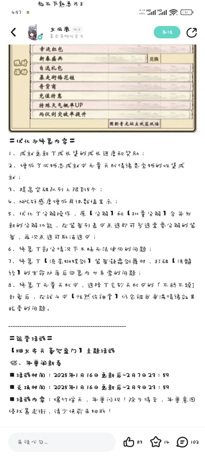 其实不能说完全没有机会赢,在练度碾压,装备碾压的情况下,如果运气很好,还是可以挡一下的,当然仅仅挡一下是不够的,得最少连续挡2下就有机会赢[表情_大笑][表情_大笑],,,所以,玩21的朋友们,不要放弃,虽然副本没人要,远程打不过,近战碰运气,但好歹我们是悟性发育,只要不打架,副本找大哥,潜心发育,还是有机会在3轮之后玩六脉打赢秀菊的[表情_大笑]#晓峰 #暴走英雄坛 #火凤凰 #顾炎武 #暴走英