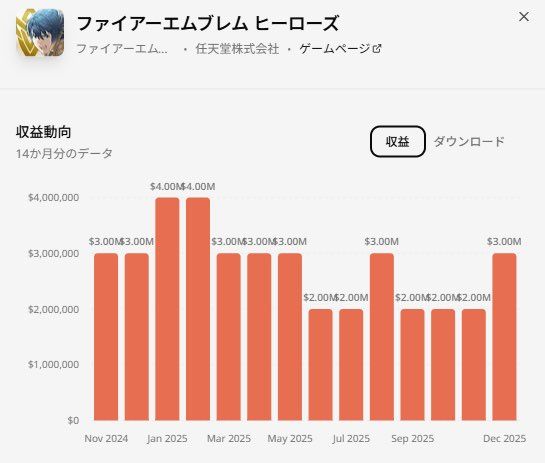 🔥火焰纹章:流水曝光! 任天堂旗下知名战棋单机IP《火焰纹章》系列改编而来的手游作品《火焰纹章 英雄》近日其收益图表曝光,据悉这款任天堂旗下的手游《火焰纹章 英雄》在过去的一年时间里,持续保持着稳定的收入能力。 🔥才几百万刀!具体来看,游戏营收在25年1月初达到了一个约400万美元的小高峰。随后虽有一定波动,但整体维持在数百万美元级别。在25年的五个月中,游戏收入却下跌到了200万美元左右,