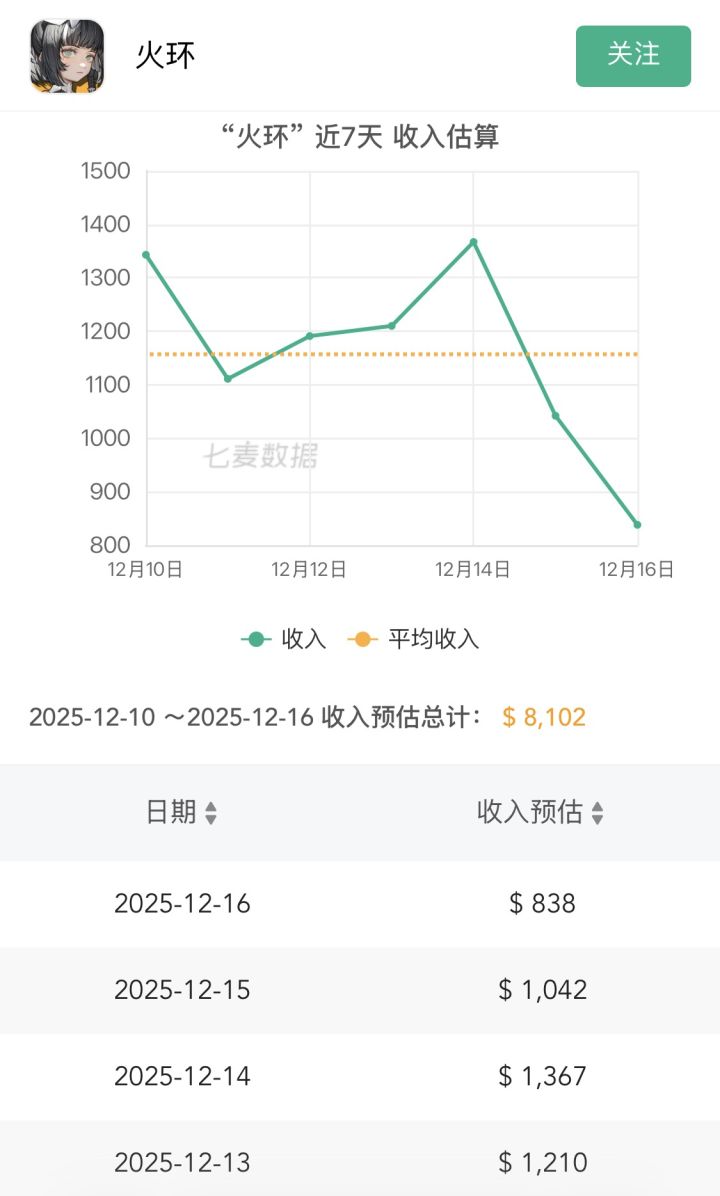 2025年12月24日,第三方数据平台及行业报道综合显示,由上海月胧吟开发、叠纸游戏投资的横版动作ARPG手游《火环》,iOS端首个版本流水仅约3.2万美元,在同期上线的二次元手游中排名垫底。该游戏iOS端于12月1日正式上线,较安卓公测延迟3天,首月流水由首日的60美元逐步波动,最高单日流水为12月3日的4074美元,后续因口碑下滑再度回落,全月未出现有效增长峰值;游戏上线后未进行任何推广投放