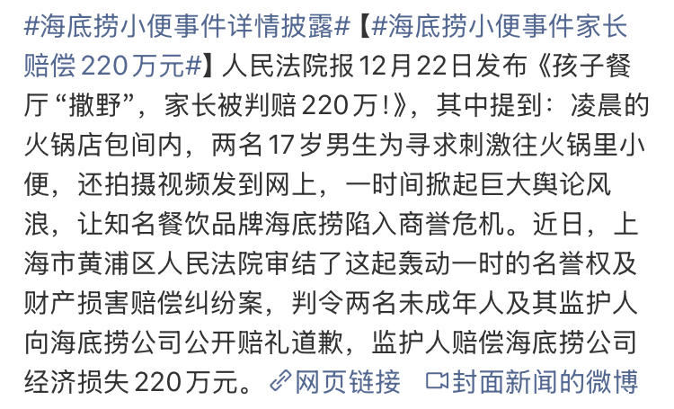 之前关注了很久的海底捞撒野事件终于有结果了,不出意外的巨额赔偿,两家赔偿了220万,对于很多家庭来说都是一辈子的收入了,真的是要管好熊孩子了。 #生活杂谈 #热点事件 #火锅