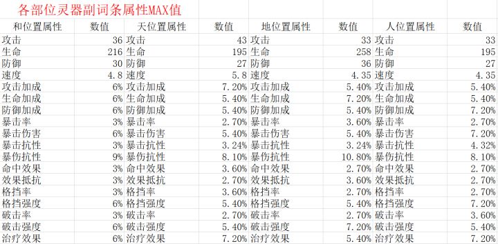 全部位灵器副词条MAX值