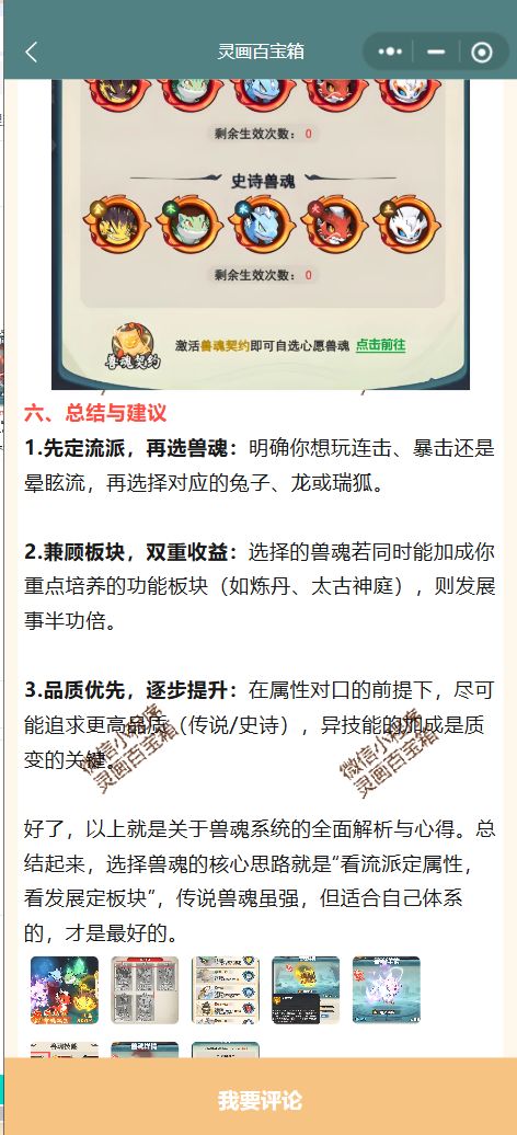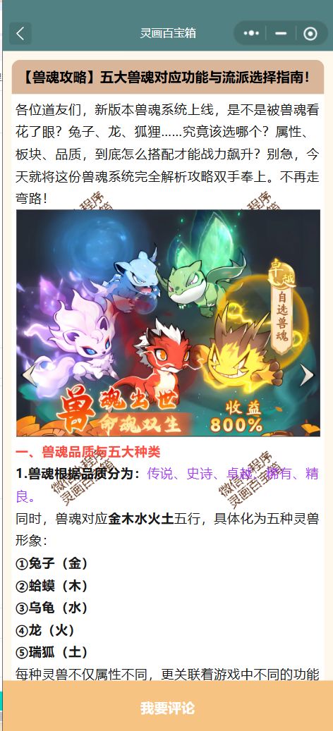 各位道友们,新版本兽魂系统上线,是不是被兽魂看花了眼?兔子、龙、狐狸……究竟该选哪个?属性、板块、品质,到底怎么搭配才能战力飙升?别急,今天就将这份兽魂系统完全解析攻略双手奉上。不再走弯路!一、兽魂品质与五大种类1.兽魂根据品质分为:传说、史诗、卓越、稀有、精良。同时,兽魂对应金木水火土五行,具体化为五种灵兽形象:①兔子(金)②蛤蟆(木)③乌龟(水)④龙(火)⑤瑞狐(土)每种灵兽