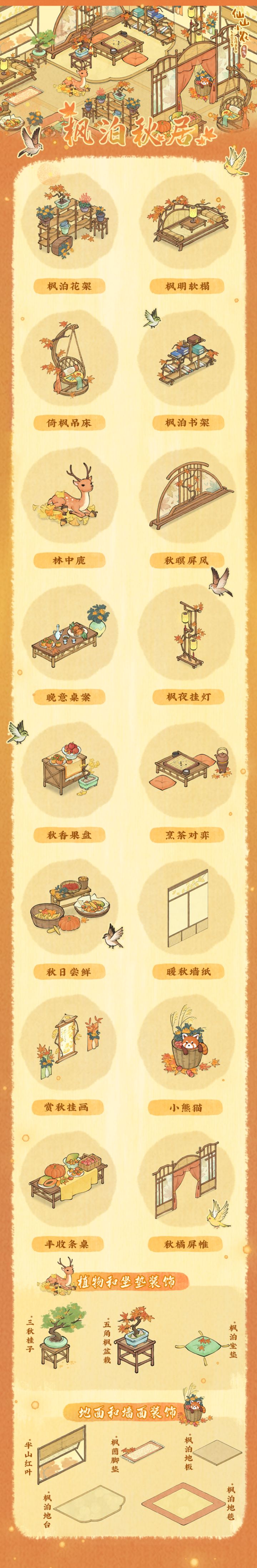 🍂全新系列装饰「枫泊秋居」将于12月30日上线,欢迎小农前往灵盈峰探索获取~🍁枫泊秋居🍁🍂新增「枫泊秋居」系列家具装饰,探索灵盈峰,开启山精商店,可兑换系列养成家具。以下是部分装饰介绍。🍁枫泊花架🍁🍂赤叶托群芳,秋色共一堂。⭐满星预览⭐增加10%强化归元鼎时获得的强化经验。🍁枫明软榻🍁🍂软榻斜依对晚窗,身畔似有枫飘落。⭐满星预览⭐完成飞艇订单时,额外获得10%宗门贡献🍁枫泊书