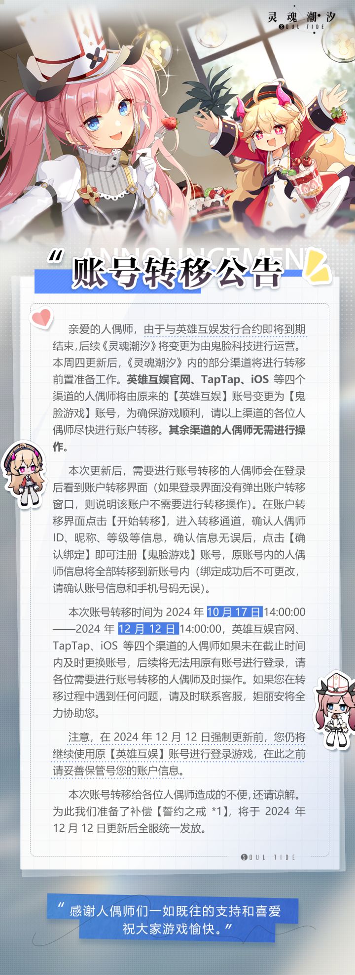 行没有钱想问一下大佬,就是之前正好氪了金,这不回归了吗?结果就看到这个公告,现在是账号全没有了,这种情况要怎么办,就只这样吗?##灵魂潮汐 #灵魂潮汐账号 #灵魂潮汐账号转移