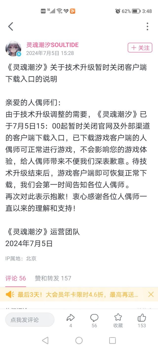 官方发表回应,是技术调整,同时关闭官网下载入口个人看法:这个情节咋这么熟悉呢?不会是赛马娘国服吧...#今天游戏圈发生了啥 #游戏资讯 #灵魂潮汐