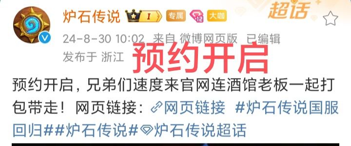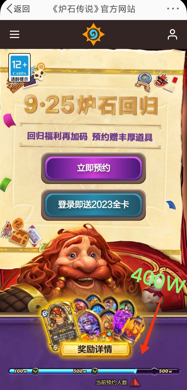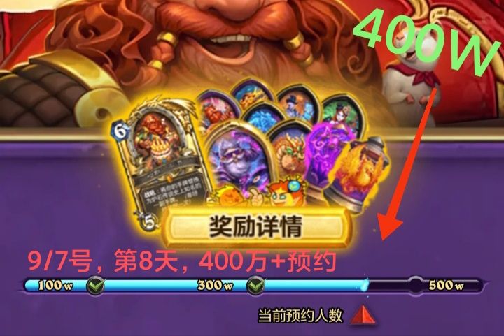 9/7号,《炉石传说》官网的回归福利预约人数已经突破400万啦8/30才开启的预约;第一天预约人数破100万;第四天预约人数破300万;第八天预约人数破400万!这么多的预约人数,大家懂得都懂,一起来猜猜多久才会突破顶格的500万预约个人盲猜是15天之内,相信网易#今天游戏圈