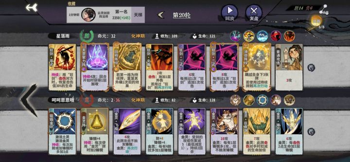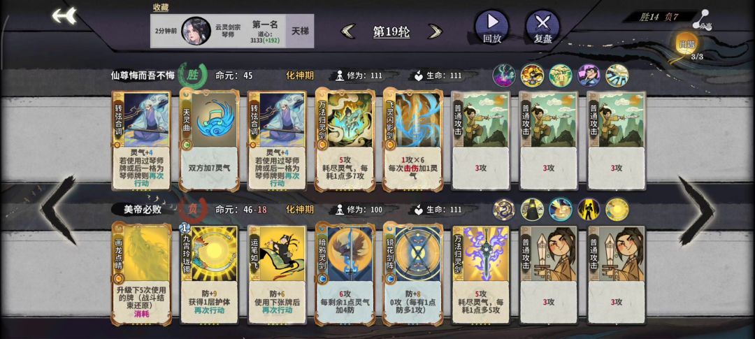 #狂剑 #炎雪 #轻剑 #弈仙牌 #弈仙牌攻略 本贴旨在能够在护体丹等级偏低的情况下为大家提供一点博弈思路从而扭转局势反败为胜,对局分段不高,但胜在比较典型。前情提要:本次对局一个熟练度较高的锦毛鼠幻探云踏云猫,共四次对局。我方手上只有一级护体丹,而对方猫猫修为不低又有高等级游龙破护体,且打法上一直在三动四动杀之间横跳,因此本对局我方较为劣势。14轮:之前对局猫猫均为四动杀,并且我方低估了锦