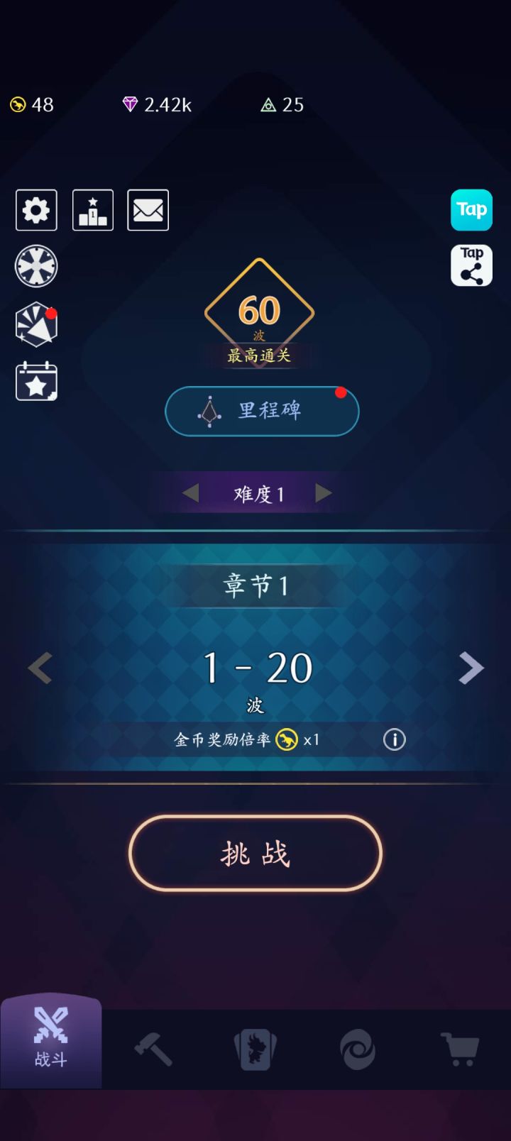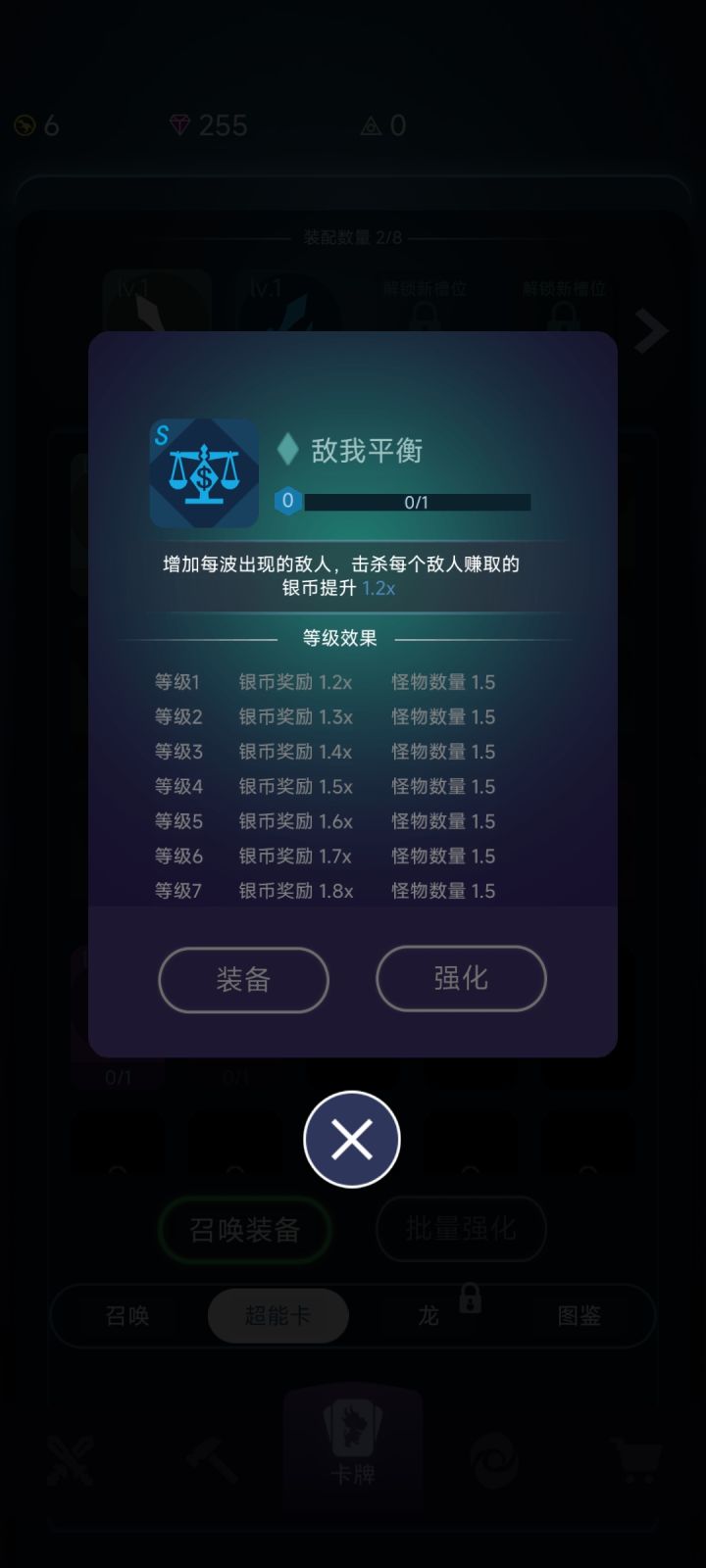 玩了几个小时了,刚打到难度一660波,给大家分享一下我的游戏经验一开始随便玩,刷金币场外金币点每波银币等有几张超能卡之后,带好卡片才能多刷金币。前期优先带强化等级高的攻击攻速,游戏内到一定波数了可以更换中级高级的,具体什么时候哪个好可以游戏内更换一下自己看数值对比。刚开始因为超能卡加成,不用升级攻击类技能都可以过一定波数,这个时候先把经济收益提升一下,主要升每波银币和银币奖励。升到升级需要