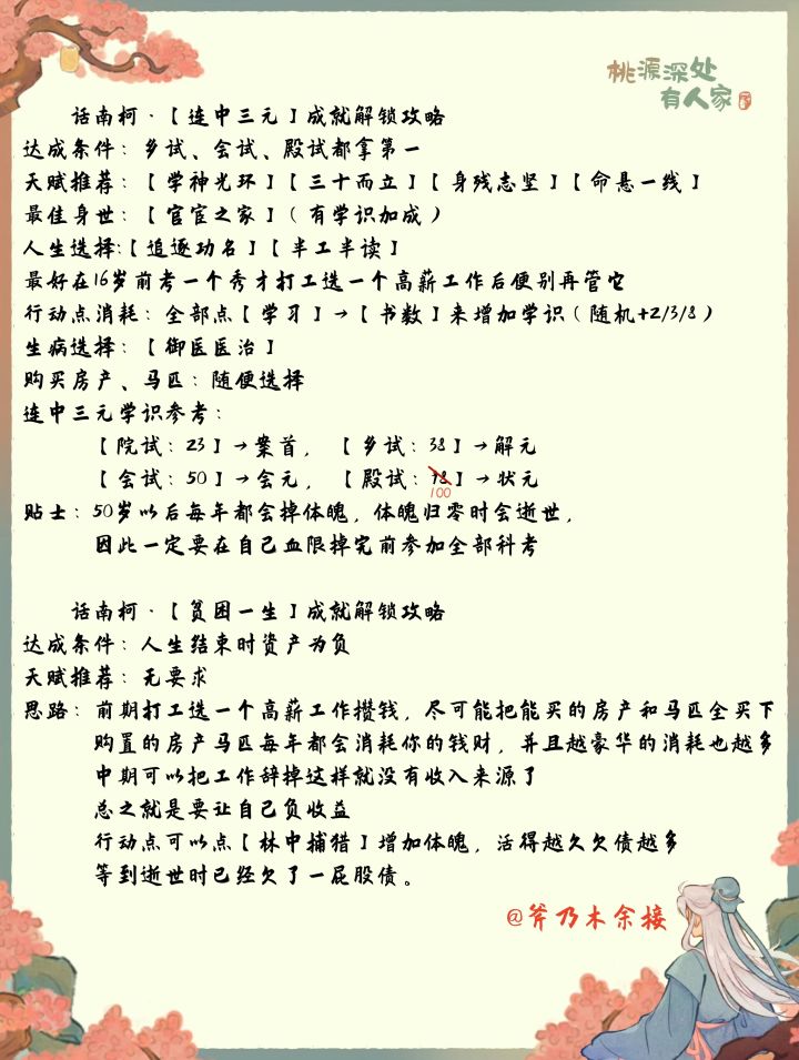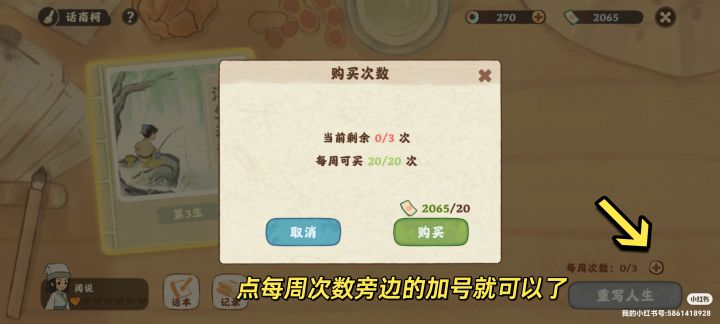 @摘一颗柠檬味的星星这个每周一共可以玩二十三次!免费玩三次以后可以用桃花票再买20次(看图二)!!如果你想,可以玩到腻为止!1.天赋点建议每个都起码选一次,因为会解锁相应的收集成就。2.九岁可以上学以后记得留行动点考学:【考学_与夫子对答_涨处世】【考学_学书数_涨学识】【考学_学礼乐_涨魅力】【考学_读史_涨德行】3.如果不学习或者考完功名以后: 【提升自我_琴棋书画_涨魅力】