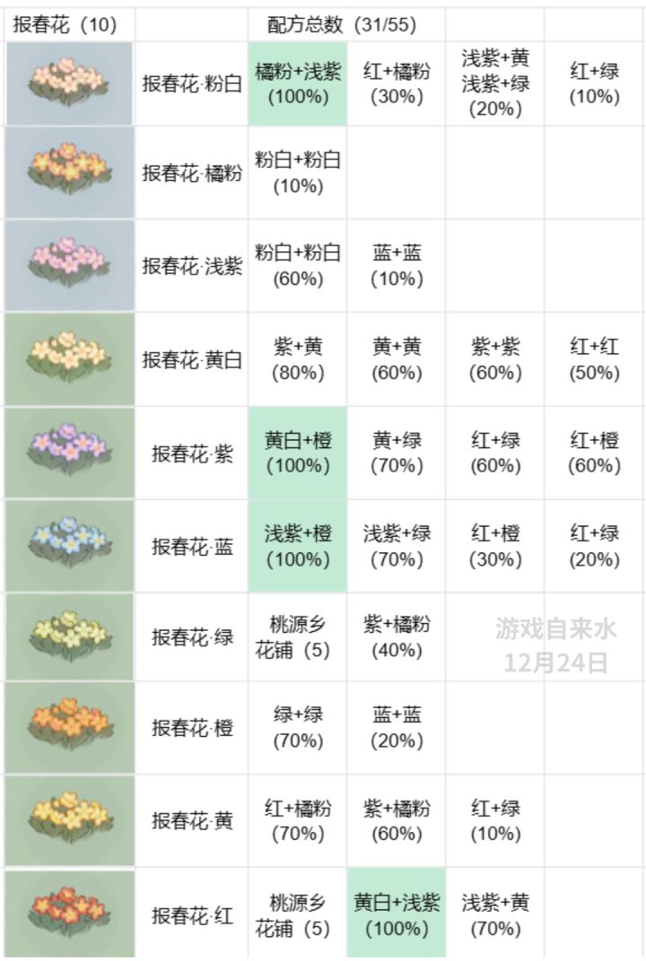 概率是玄学,我这是真的概率,不是钓鱼时间那个假概率。一种配方测试十次,一种花五六十次,高的甚至一百多次。测试至少使用了五六百支取粉笔。12.11:此次更新全部配方。 参考鹿酒丸子和铃儿响叮当角堇和石蒜的稀有花配方。这两个有的稀有花的配方太离谱了。 后续还会持续更新。 12.24:1,概率仅代表每一种配方我至少测试十次2,每个人概率可能会波动,高于50%的概率,我进行