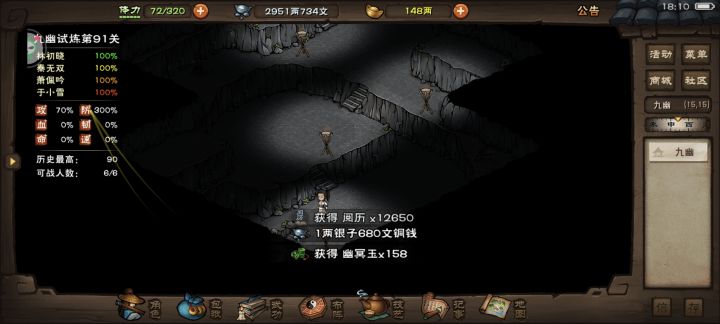 之前忙着考试没时间玩,四棍号鸽了两个月,放假知道萧大加强也是第一时间下回来了,今天一试,用了一个多小时拿下武神殿绝世,破狼还是好用啊,可惜出的太晚了。附上面板截图,个人觉得李子最难,主角容易暴毙(没喝腊八粥,不然不用凹这么久),然后其他都还行,诸葛比较看脸,稀里糊涂就过了。最后附上面板截图,晚上熬夜去建设恒山去了#烟雨江湖四棍 #烟雨江湖开荒