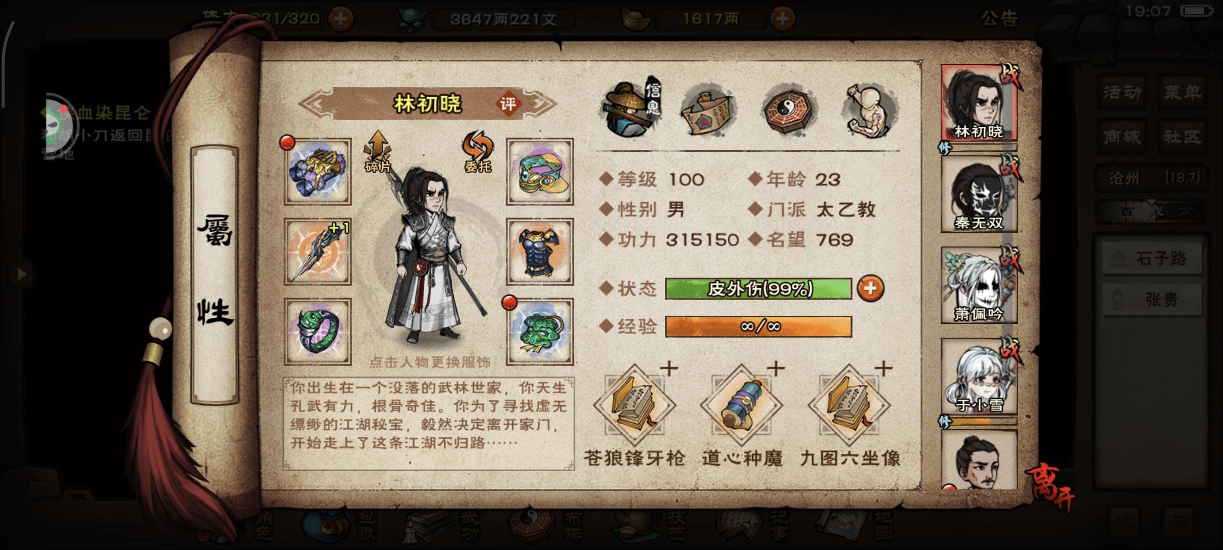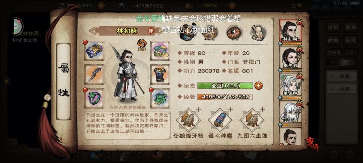 这真是我感觉最难的一个副本。林雪鹊凹万象反弹的序列,莫名其妙的四连招架。以及沟槽的王麟,三个蚊香使三回合全部打死。硬生生让我在副本待了一天。还得一个月才能回苍狼。不知道能不能提前开合道。后附上,面板截图#烟雨江湖四棍 #烟雨江湖开荒