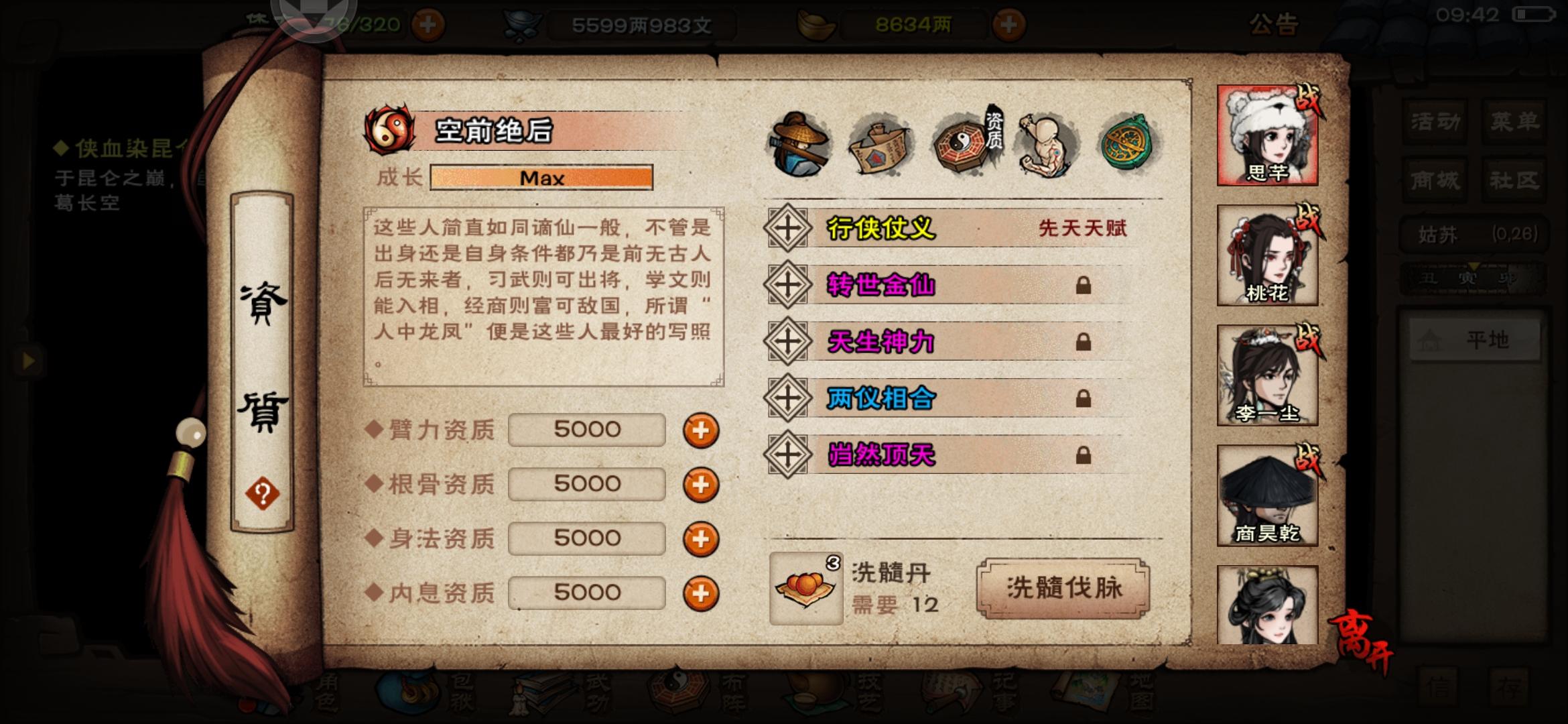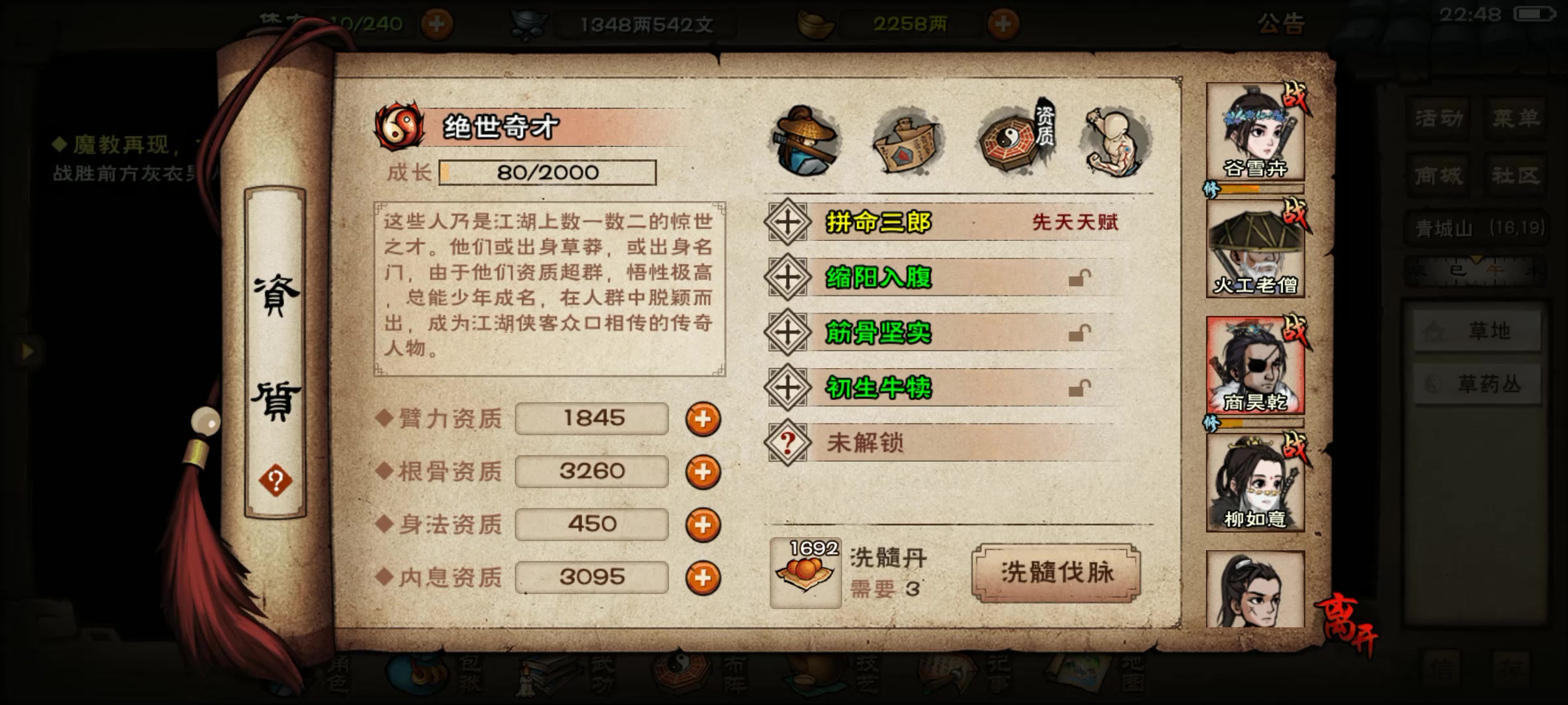 一直没正式洗过脉,终于攒了1600多丹,也看了不少攻略,发现只有商昊乾可以在200内出现紫脉,其他的都得500以上,主角甚至要1000丹。就先洗商了,一开始还不想要鬼脉,不过想到后边我要换血魔经,鬼脉也就鬼脉了。#烟雨江湖洗脉