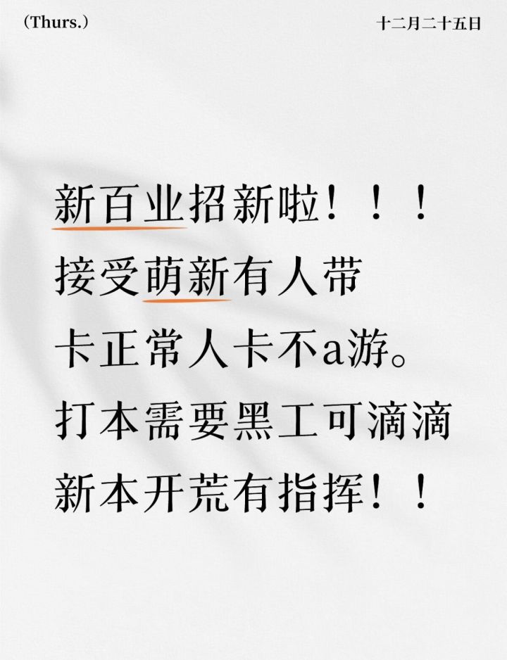周一周五组织带团本,20+一剑称号,每晚组织活动,长草期可以玩鹅鸭杀,周活要求 1500+,战力要求男 1.85 鹅,妹子 1.80 鹅,可以免费帮忙调号,本百业互帮互助,名额有限,欢迎活跃的玩家!!!#燕云十六声百业 #燕云十六声百业招人 #燕云十六声