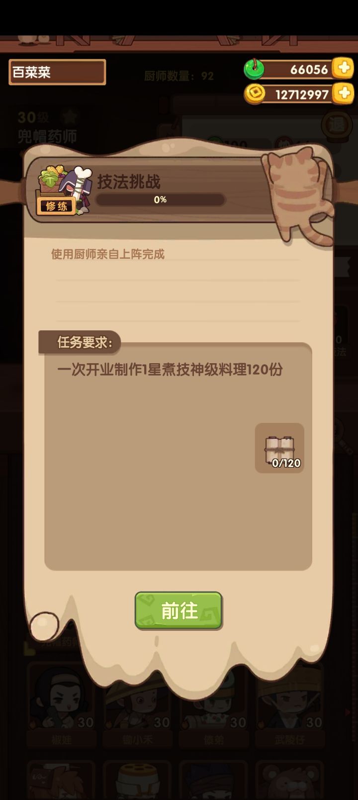 想请问一下,就是这种一火厨师修炼,他的技法挑战是要求一次性做三道神级料理,但是因为已经给他升满级了,符合的三道菜怎么做最低也是传级了,如果做的传级是不是也不算啊?必须要神级吗#爆炒江湖七 #爆炒江湖