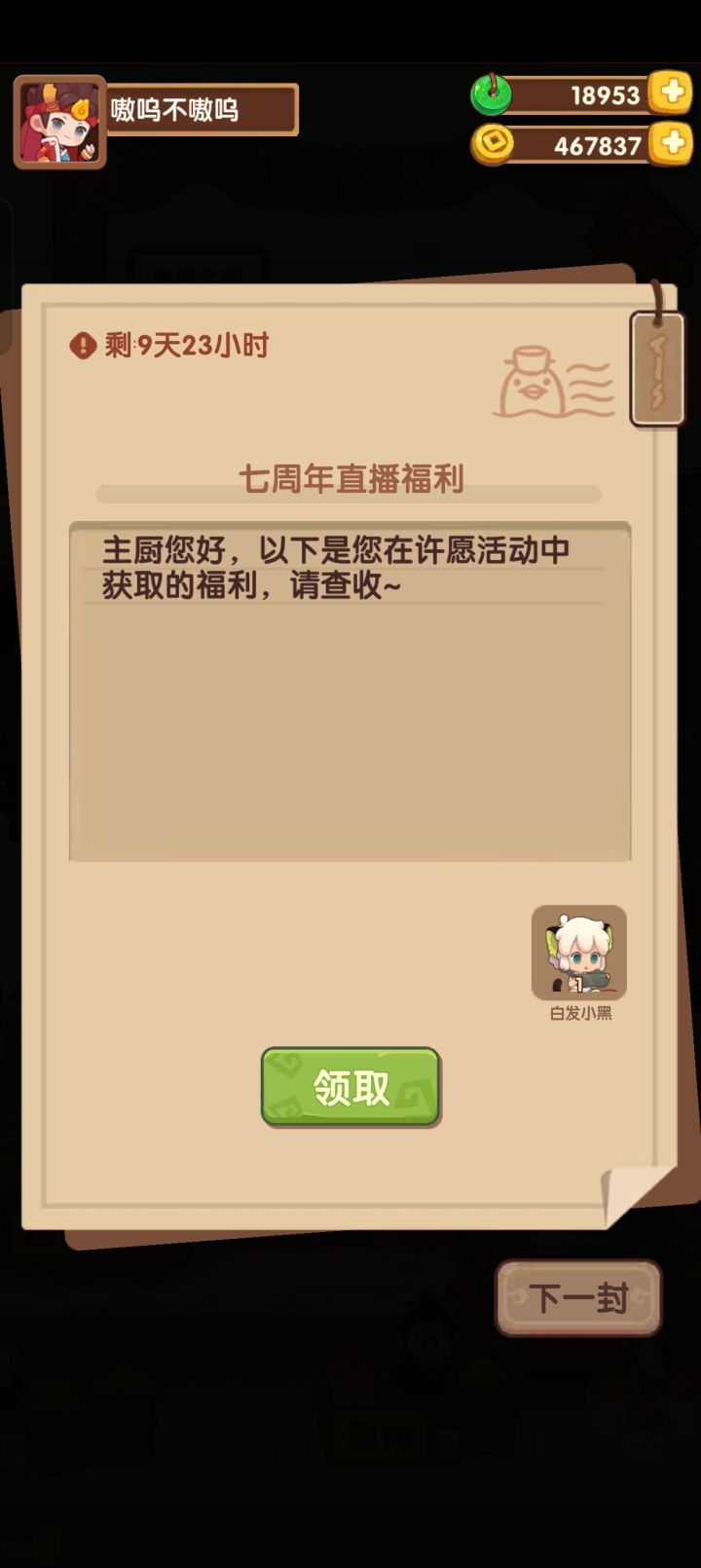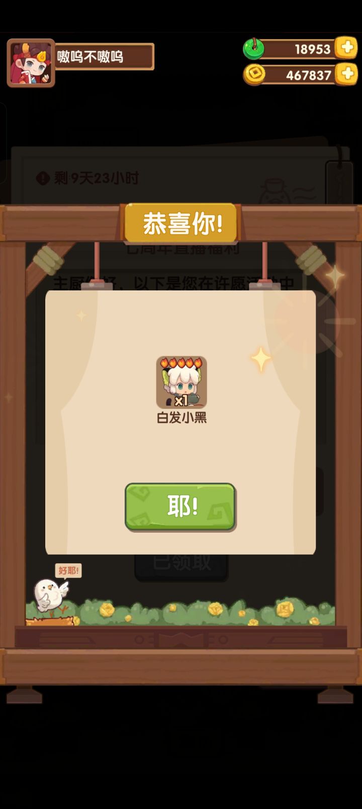 一开始只是抱着随便发发的态度投的许愿征集,单纯挺喜欢小黑这个角色而且也很强,所以就随手投了,结果真的中了,就是暂时没法修炼用不了,希望周年庆有切炸修炼菜,这样补个夏日就能修了在直播抽的时候一眼就看到我的邮箱名在前面停着(可能是因为我投的比较晚刚好又是逆序排列的),我还在想应该中不了吧,毕竟每次抽奖啥的都是谢谢参与所以没报什么希望,我的邮箱停在方框里面的时候我还愣了一下,然后就去群里炫耀了哈哈感