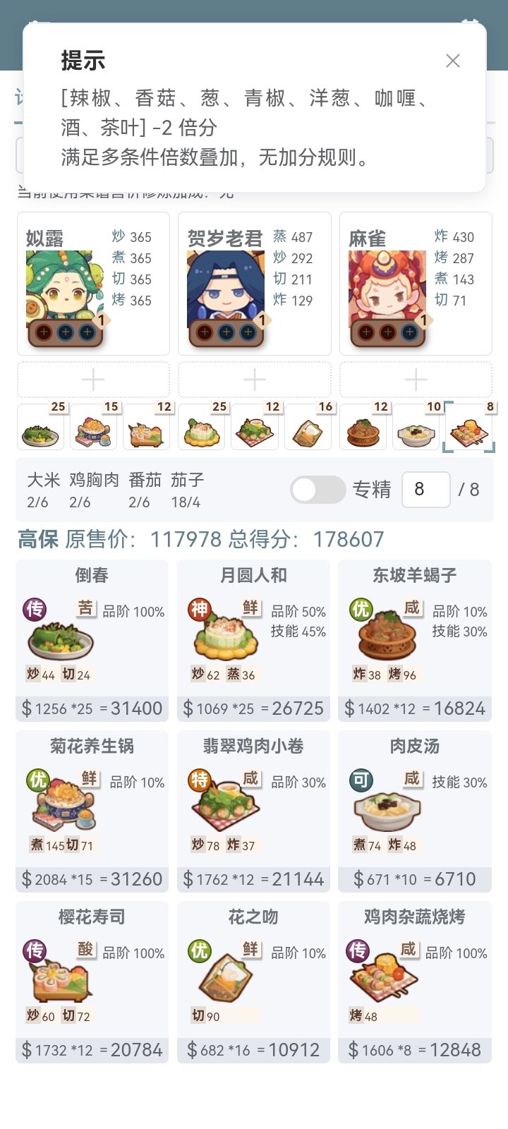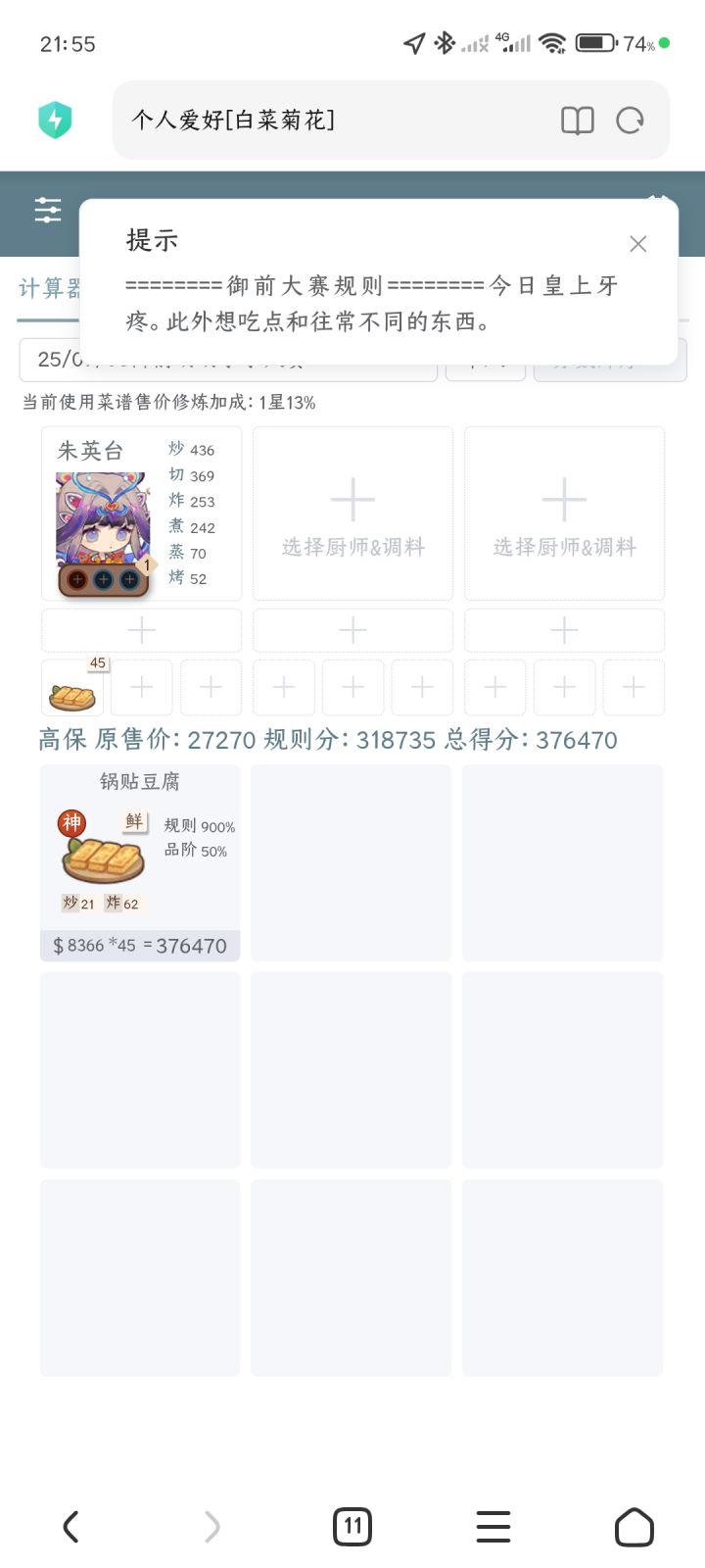还好研发的莓果思慕雪第二锅出了,甜味御前高保拿下。上上次御前面点大赛靠3发抽出了荔枝虾球过的,这次荔枝虾球依然立大功。本来郡级风云宴就拿不满,厨神中保真的会难受死我,还好连滚带爬也都高保了。风云宴升早了,郡级每次都拿不满,第二档都要凑半天才行,问就是非常后悔......这周试了下还在三档,等周末抽完情人节池再算。#爆炒江湖 #爆炒江湖厨神
