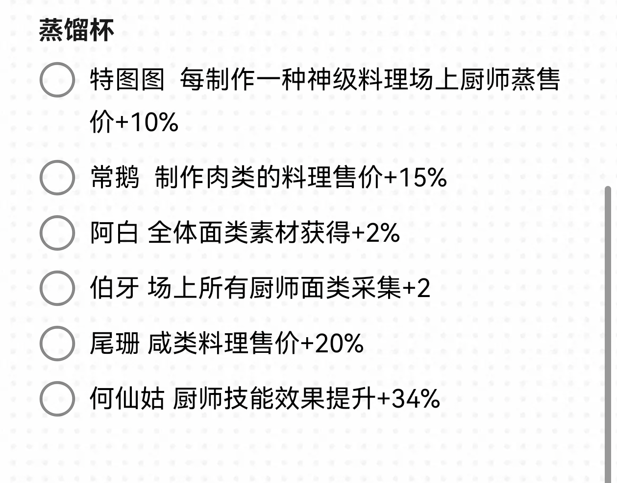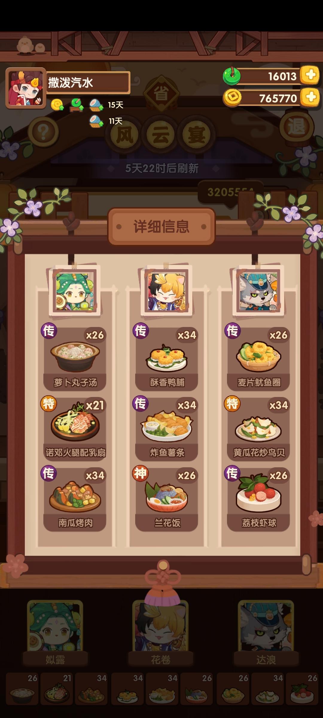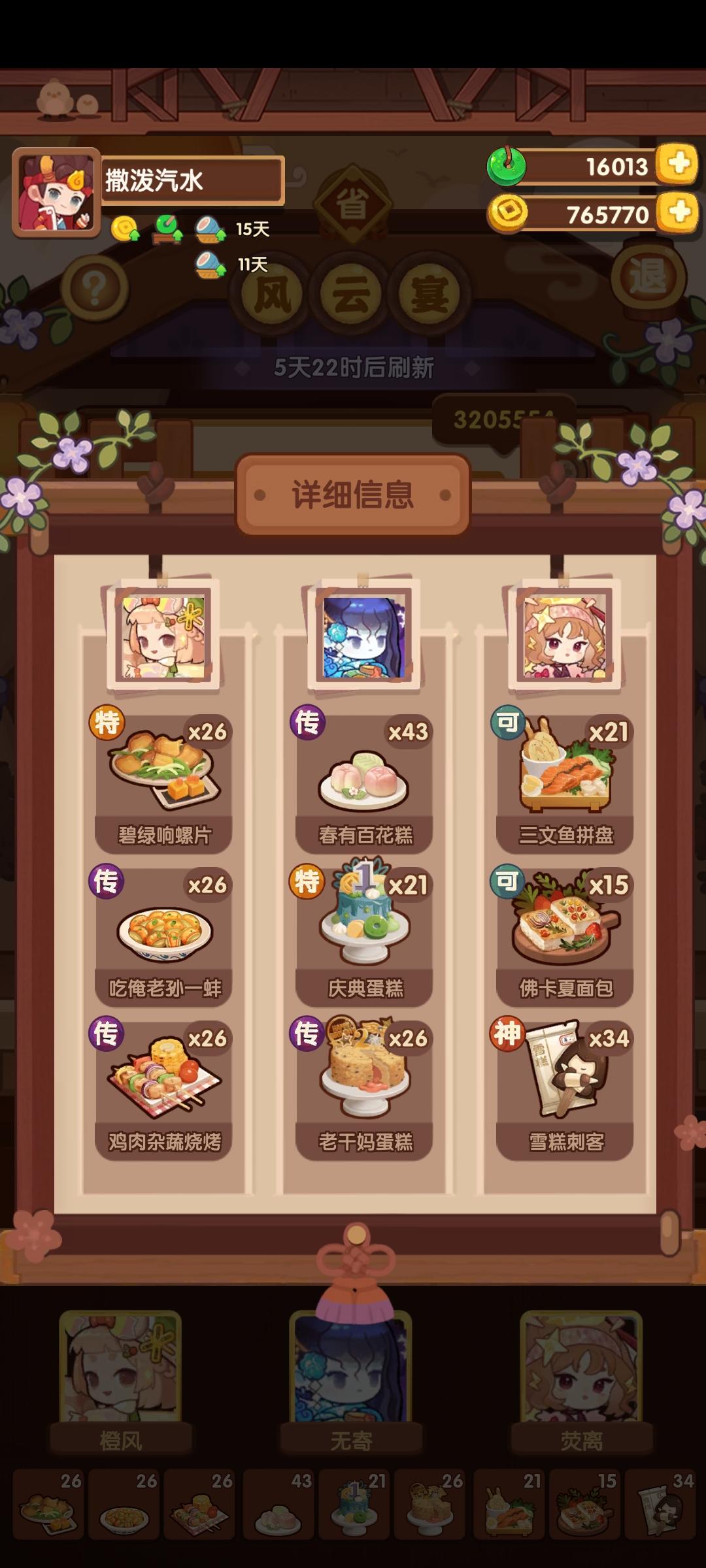 差一道琳琅修炼菜,双11的得莫利炖鱼、六周年奇石的五圆鸡、樱樱樱的痛风锅都可以,不知道该选哪个池。我是元气充能入坑的月卡党,目前情况大概如下:风云宴郡级,厨神御前高保。基修约等于无(p2)。符文菜每种都补了(p3)。池子抽了元气以来的新池、碧池、情人节、鼠春、晚秋。现在用的贵客厨是林时恭,孑子推和盐如玉(都可修)。之后大概计划抽琳琅,补圣诞池抽小白,抽混沌子。看了下攻略,这几个池子