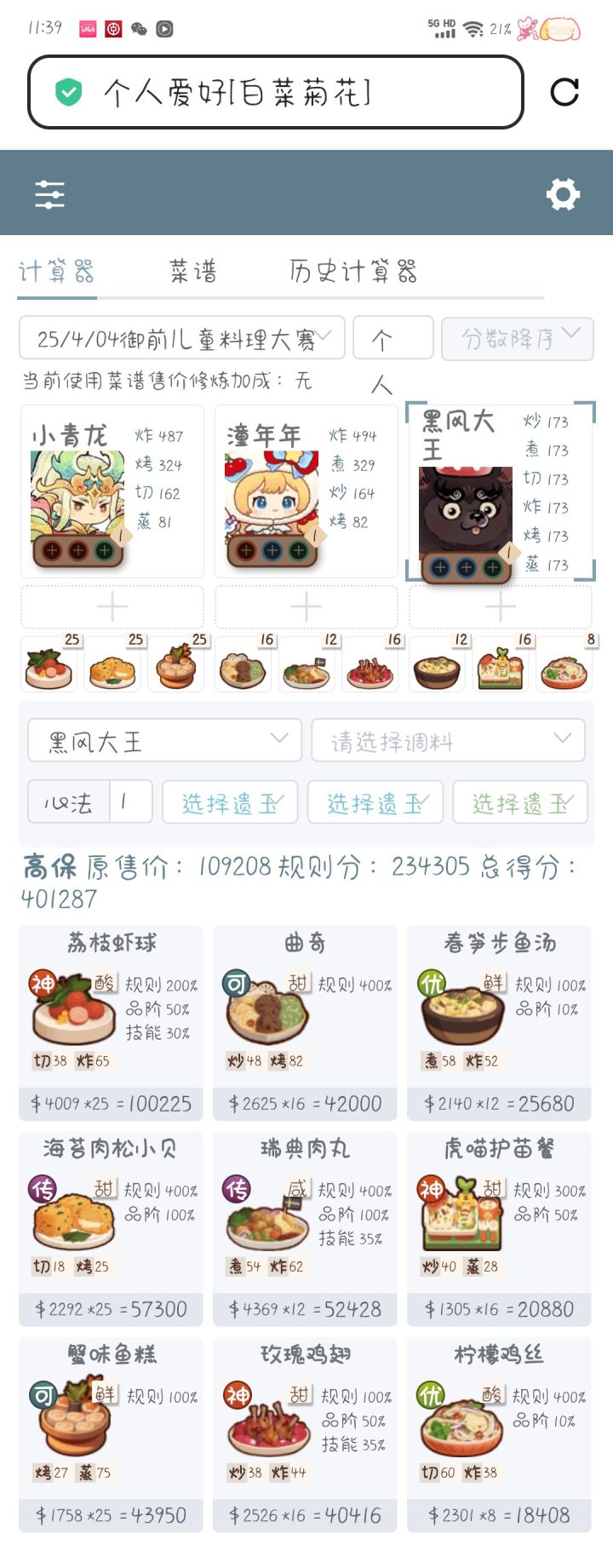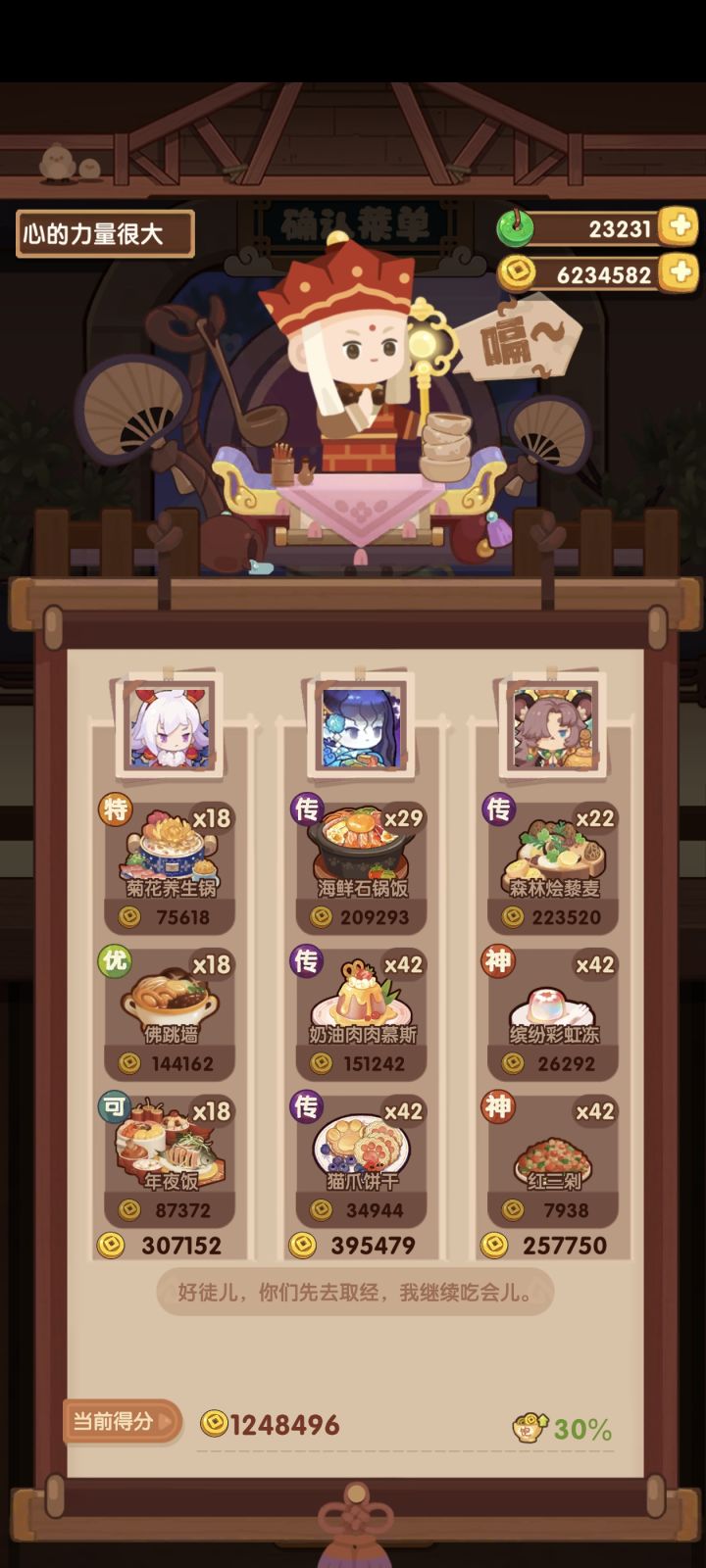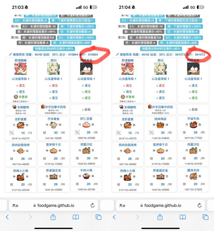 以这期宴会为例,白马王子第一个厨子意图是三道蒸,凑饱食度填了几个菜以后再选厨子但是特图图是只对后面厨子做的蒸技法菜有加成,而我们后面所选的菜只有两道是蒸技法菜所以目光转向舒婷的“肉类基础售价加成”注意,舒婷这种厨子我们一般碎厨具很频繁,哪里需要往哪搬的性质,所以不建议用一些比较珍贵的厨具,随便丢点新手池厨具用用就够了接下来我们转第二个贵客这是我一开始的算法,阿狸还没有修炼,只是单纯凑了三