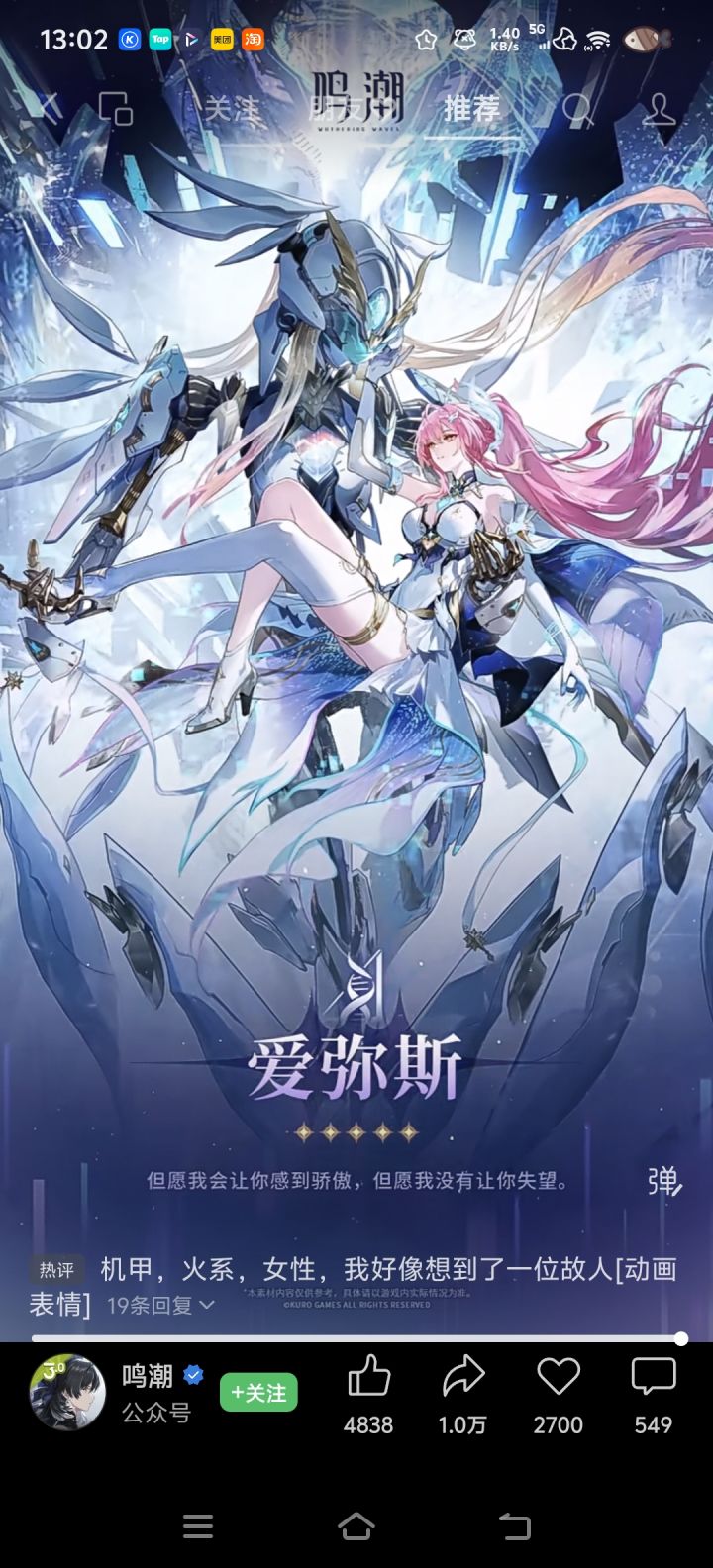 #鸣潮 #鸣潮爱弥斯 “但愿我会让你感到骄傲,但愿我没有让你失望。”——爱弥斯档案资料>>爱弥斯曾是星炬学院的隧者适格者,现已成为无人可见的“电子幽灵”。她以活泼俏皮的姿态与身边的人们来往,兴趣爱好颇多,既享受着自己的校园生活,也喜爱和众人分享自己的快乐。异能力>>长航的星辉在爱弥斯使用共鸣能力时,会显化出「隧者兵装」并与之融合,变身为机兵形态。她轻盈地化作星辉,轻歌着于无尽的夜色中
