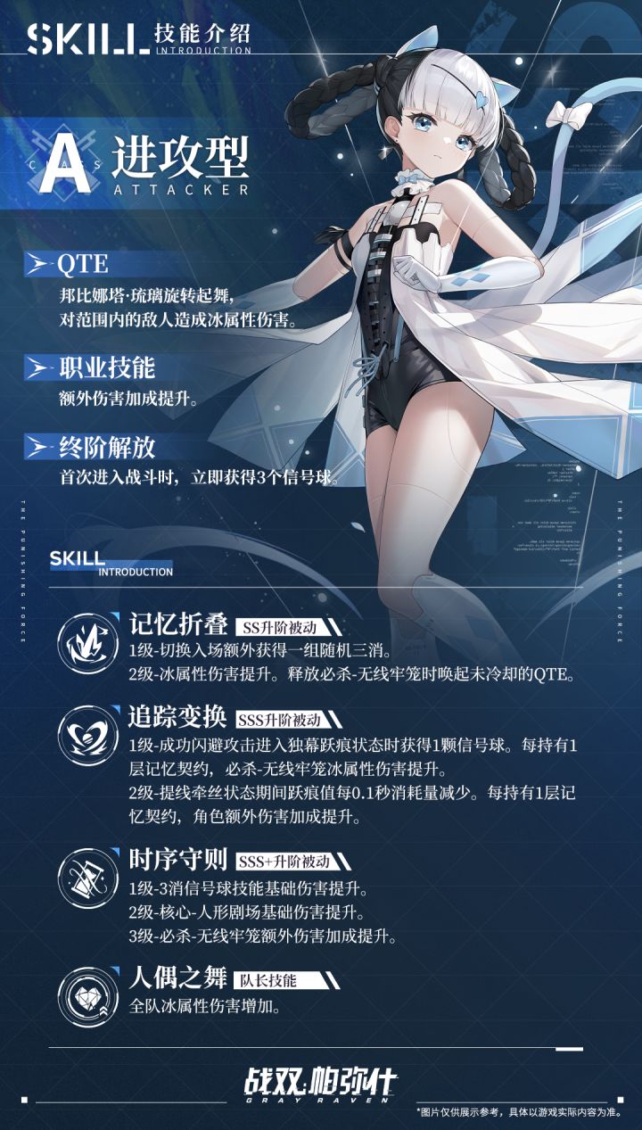 尝试开一个新栏目~(不做正事)简简单单的资讯介绍,大概之后每版本都会更新吧。内容包括新版本的角色,涂装,活动和一些比较重要的优化介绍。这个系列主要是想做一个随每版本更新的内容汇总,包括一些容易遗漏但是又有点重要的内容~同时会附带一些评价。角色介绍:此次更新了泛用型构造体角色邦比娜塔·琉璃,定位是A级冰属性进攻型角色。作为新模板下的第一个A级角色输出能力尚可,强度合理,可作为鸦羽的下位替