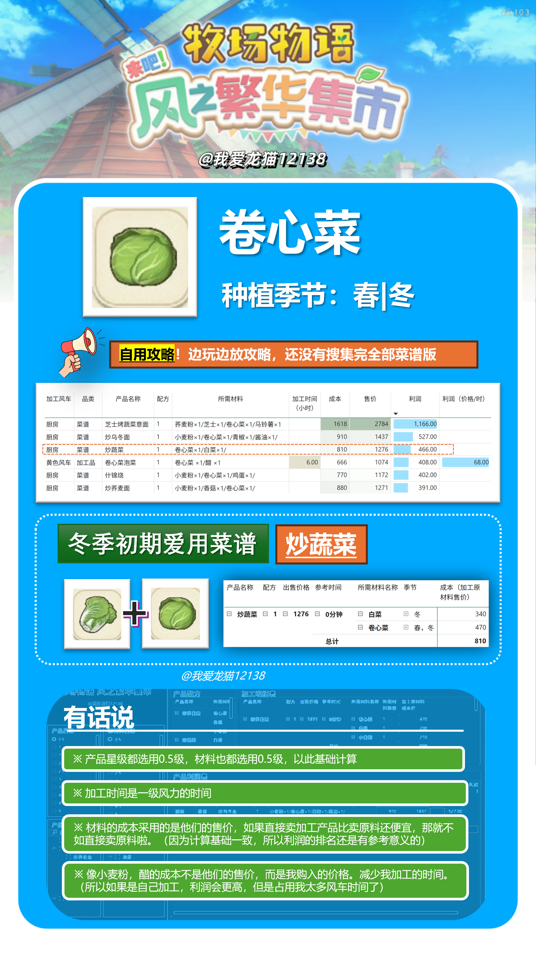 自用攻略!虽然单独开了一档,一晚上吞了好多菜谱,但还是冰山一角。而且进度还在前期数据都是自己收集的,希望有需要的看就好了,有别的赚钱法可以一起讨论,但请不要开口贬低无用论,要是心情不好就不分享了,我也没有这个义务。不做攻略好多年,最近这个游戏有点上头,所以又来好奇赚钱流了!前期的卷心菜冬天批量炒蔬菜,第一个小目标靠他了#牧场物语风之繁华集市