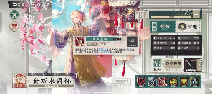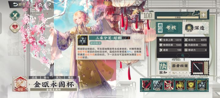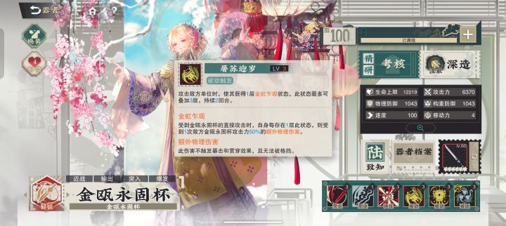 今天刚拉满的杯子,浅谈一点点心得。首先是看技能:玩好一个角色,熟悉技能很重要!!!1.职业技能:无消耗,cd2回合。 十字四格选一个方向四格内任意位置冲刺(注意!!!如果该方向有连续四个怪或者高墙、沟壑等地形会无法冲刺)。 相比其他近锐通用的职业技能牺牲了一部分的机动性但追加了伤害,而且可以搭配被动三象分足使用,冲刺后可原地释放普攻or绝技以及配合被动屠苏迎岁可以叠加一层金虹乍现状态。2