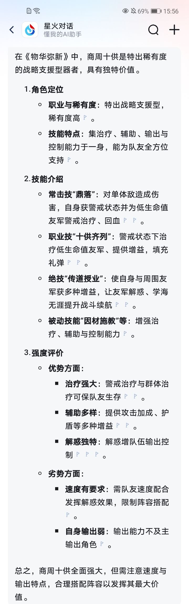 我都是问的同一个问题:能帮我解析一下物华弥新里,商周十供这个角色怎么样?然后你们也评断一下,看看这两个AI究竟谁说的对谁说的全面(顺便我也借鉴一下下)咱们一起研究研究,看看这两个AI的解析究竟谁更全面,谁说的对。#物华弥新 #物华弥新兑换码 #物华弥新茶馆 #物华弥新qq群 #物华弥新游戏群 #物华弥新bug #物华弥新开服