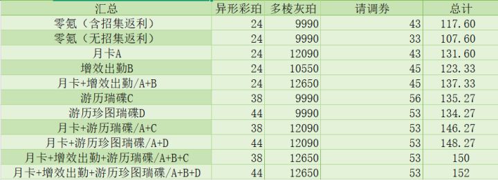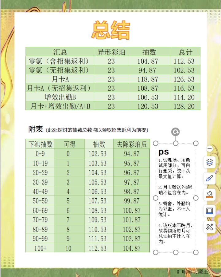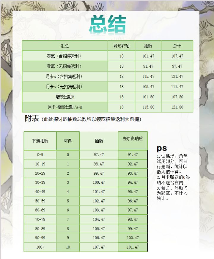 p2是总结p3是详细统计p4是官方福利图 ps:①试炼场、角色试用部分,可以根据个人情况进行删减②零氪不含召集返利统计在p2③月卡赠送的6彩珀未计算在内④该版本不跨月,易物所可兑的15抽不计算在内⑤月签到均为推算#物华弥新 #物华弥新创作者激励计划 #物华弥新抽数统计 #物华弥新攻略