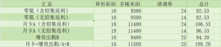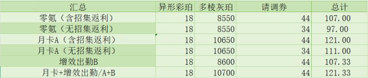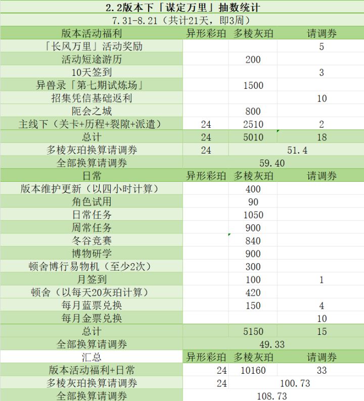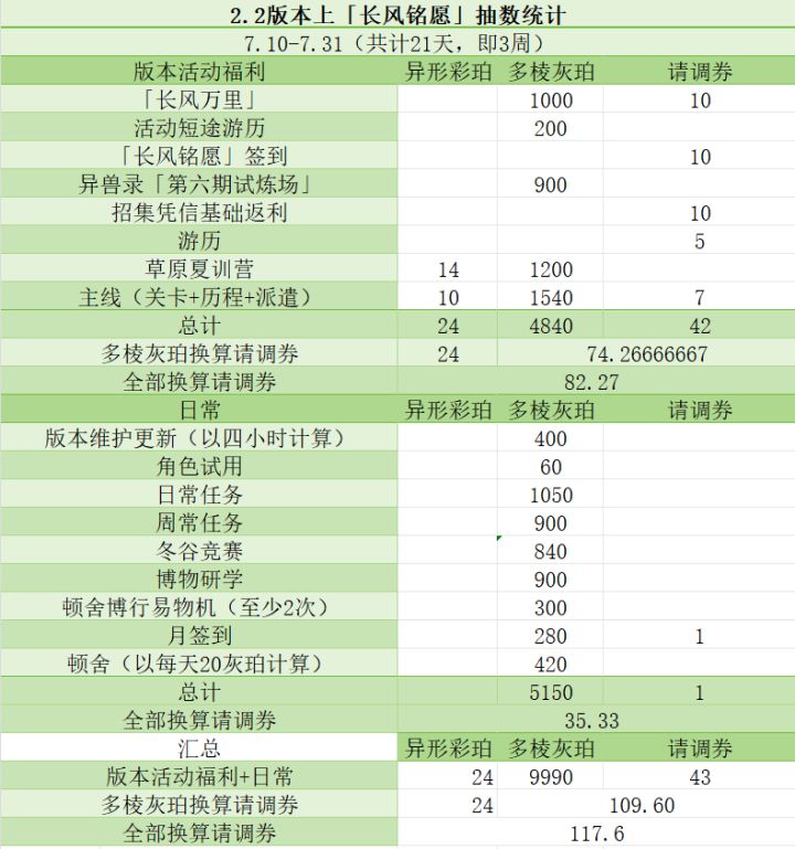物华弥新2.2版本上『长风铭愿』抽数统计p2是抽数统计p3是汇总,包含零氪月卡等统计p4是官方福利图p5是本月签到图,22号签到可得200灰珀()统计按200计算 ps:①试炼场、角色试用部分,可以根据个人情况进行删减②零氪不含召集返利统计在p3③月卡赠送的6彩珀未计算在内④2.2上版本不跨月,故每月兑换15抽未计算在内,但汉简池子日期截止8.7,可以使用这15抽进行兑换(兑换1