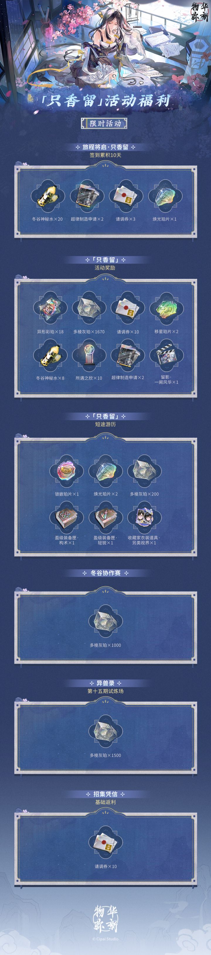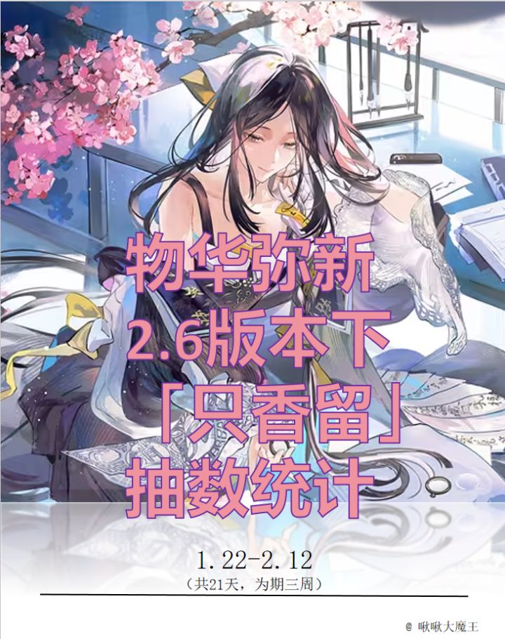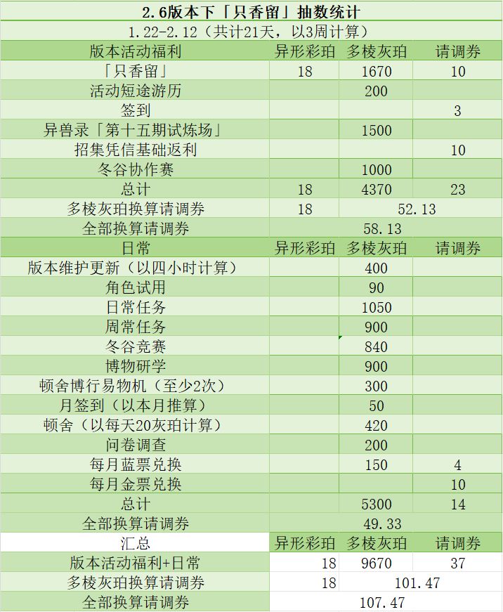 物华弥新2.6版本下『只香留』抽数统计物华弥新2.6版本下『只香留』抽数统计p2是总结p3是详细统计p4是官方福利图 ps:①试炼场、角色试用部分,可以根据个人情况进行删减②零氪不含召集返利统计在p2③月卡赠送的6彩珀未计算在内#物华弥新创作者激励计划 #物华弥新攻略 #物华弥新抽数统计