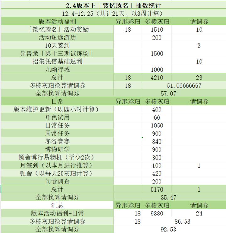 物华弥新2.5版本下『镂忆琢名』抽数统计p2是抽数统计p3是汇总,包含零氪月卡等统计p4是官方福利图 ps:①试炼场、角色试用部分,可以根据个人情况进行删减②零氪不含召集返利统计在p3③月卡赠送的6彩珀未计算在内④该版本不跨月,故相较于上版本缺少可兑换的15抽#物华弥新创作者激励计划 #物华弥新抽数统计 #物华弥新攻略
