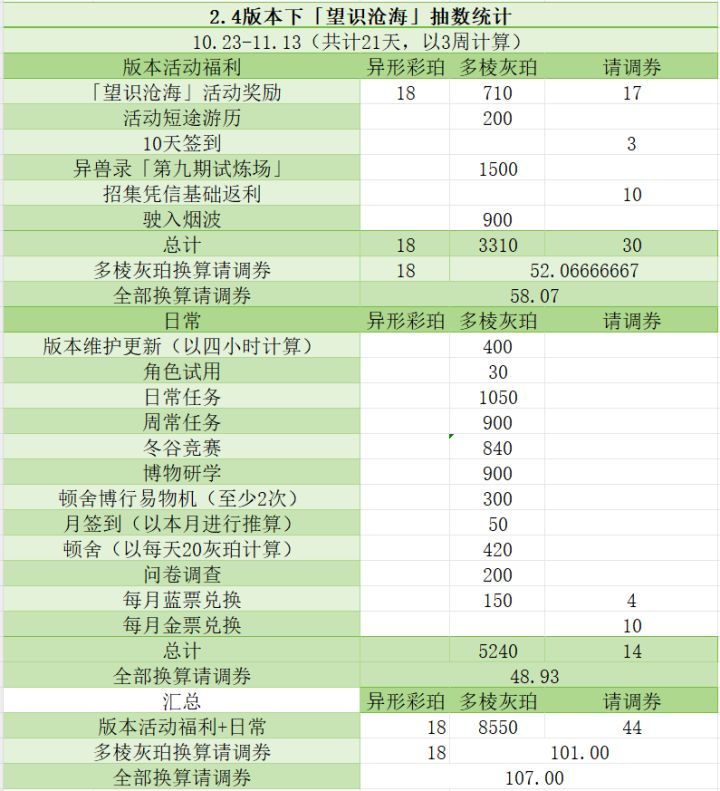 物华弥新2.5版本上『釉生净土』抽数统计p2是抽数统计p3是汇总,包含零氪月卡等统计p4是官方福利图 ps:①试炼场、角色试用部分,可以根据个人情况进行删减②零氪不含召集返利统计在p3③月卡赠送的6彩珀未计算在内#物华弥新创作者激励计划 #物华弥新抽数统计 #物华弥新攻略