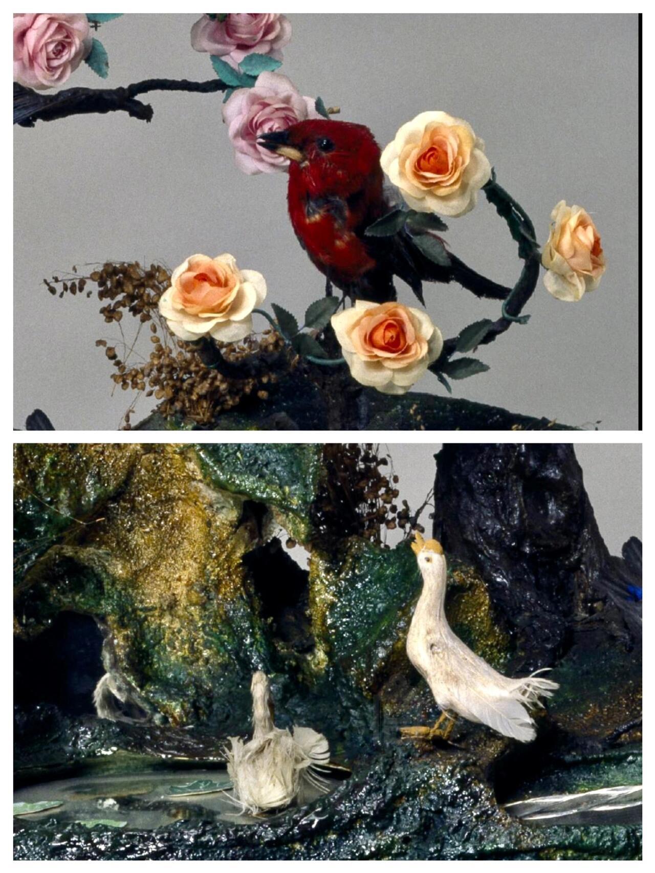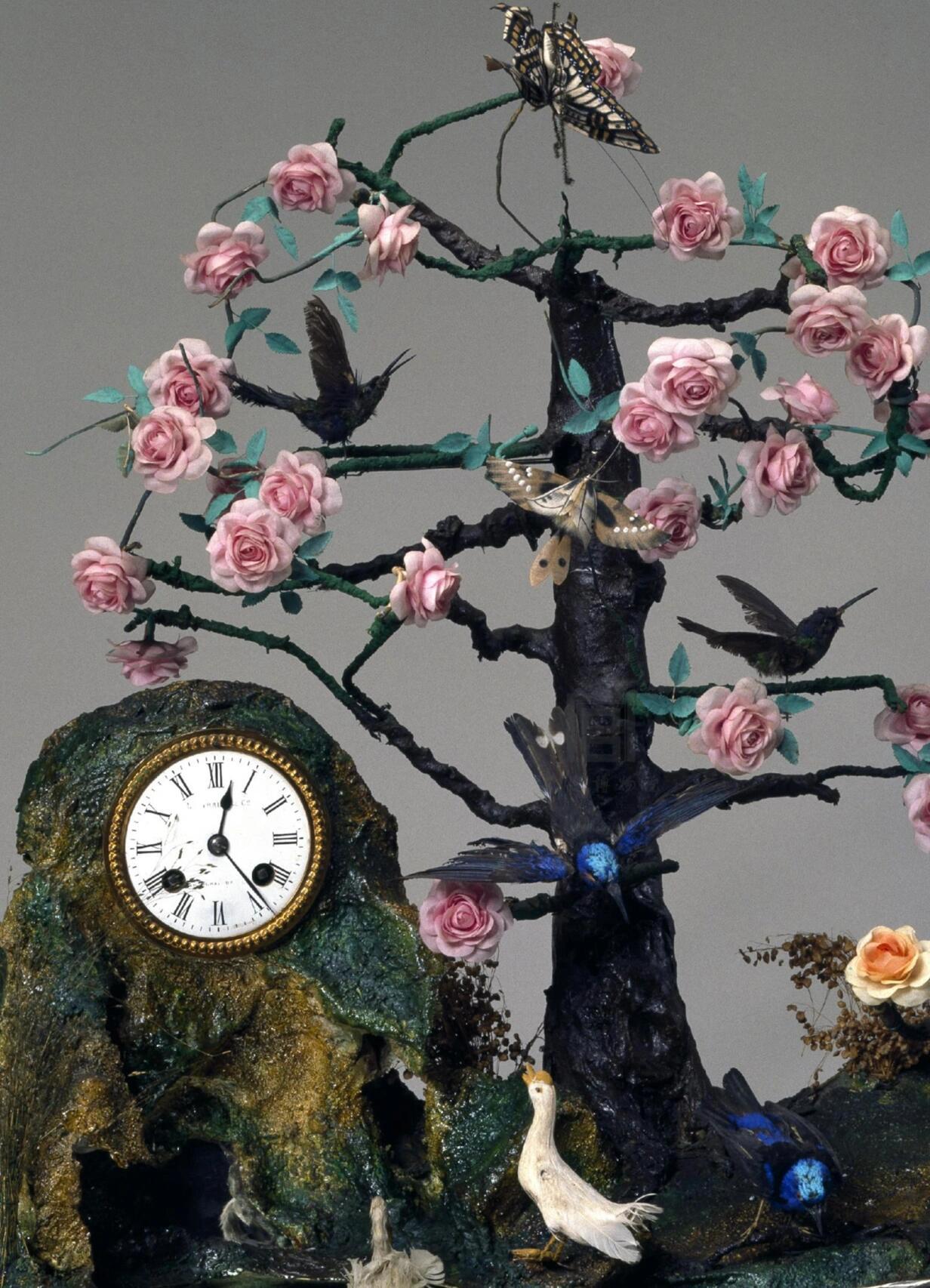 我是“鸟音山水钟”,一件19世纪法国制造的精美钟表,现藏于故宫博物院。我高71厘米,长73厘米,厚38厘米,是一件模仿大自然景观的钟表,底座铺设着红丝绒,上面布置着山石和梅树,山石前有一湖水,白鸭在其中游弋。我的钟体嵌在山石之中,不仅能够准确报时,还隐藏着精巧的机械装置。我的右侧矗立着两株梅树,一株开满红花,蝴蝶和翠鸟在花间飞舞,另一株开着黄花,一只红鸟站在树上。这些飞鸟的活动由隐藏在树干中的机