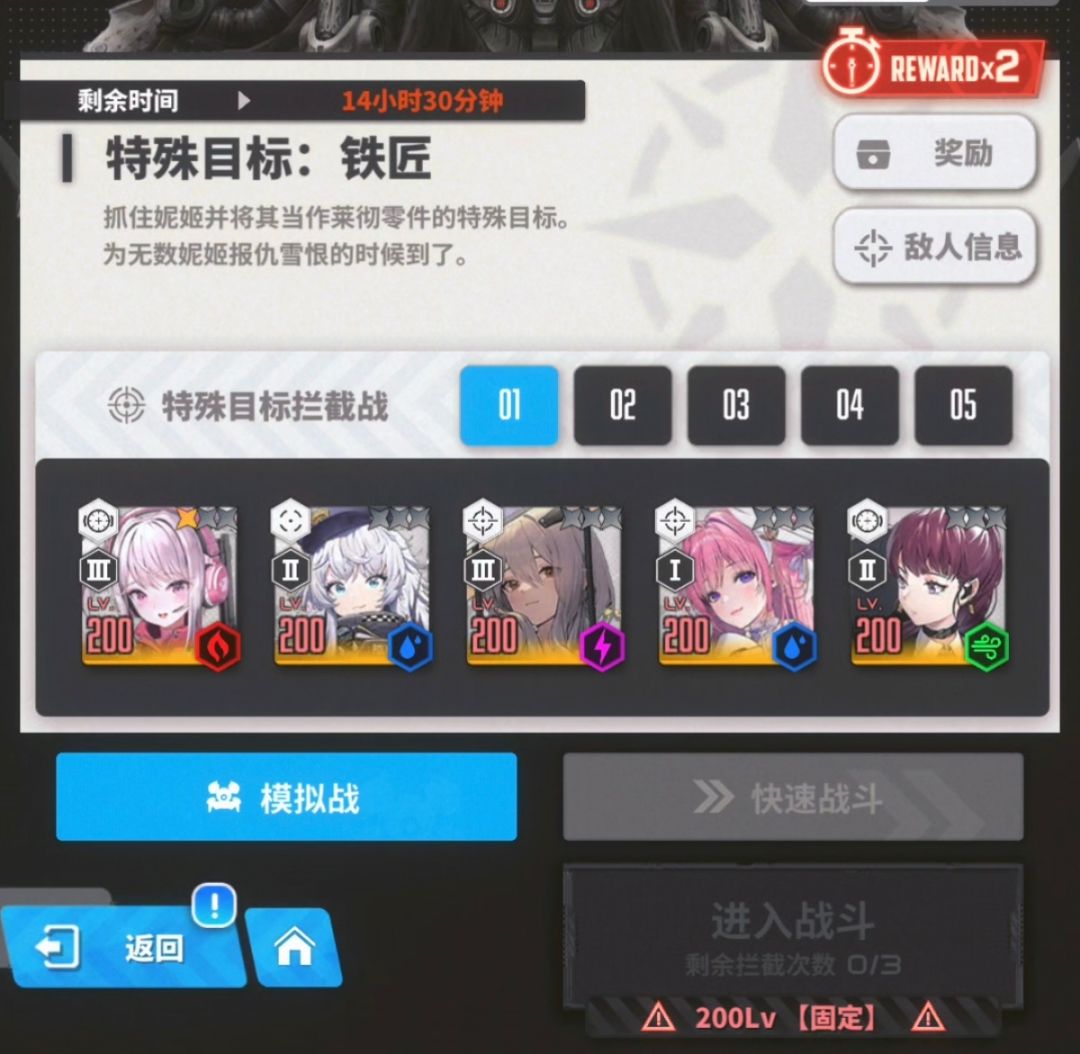 特拦铁匠血量很厚,目前直接打核心是最优选择。 飞弹也很麻烦,如果有体操达人可以扭一扭。 因为没有丽塔艾德米,带爱丽丝不如带滑板,因为清飞弹会导致丢核心伤害。 本阵容核心凹点主要只有一个,即40秒左右,铁匠准备后跳,需要关闭自动射击,同时开启自动爆裂,让朵拉充能,自动全爆裂抢伤害。之后不切换主控,也不打飞弹,直接打核心。 希望各位都能早日奖励9。打不到也不用焦虑,如视频所说,奖励7就行。毕竟这游戏只