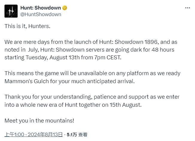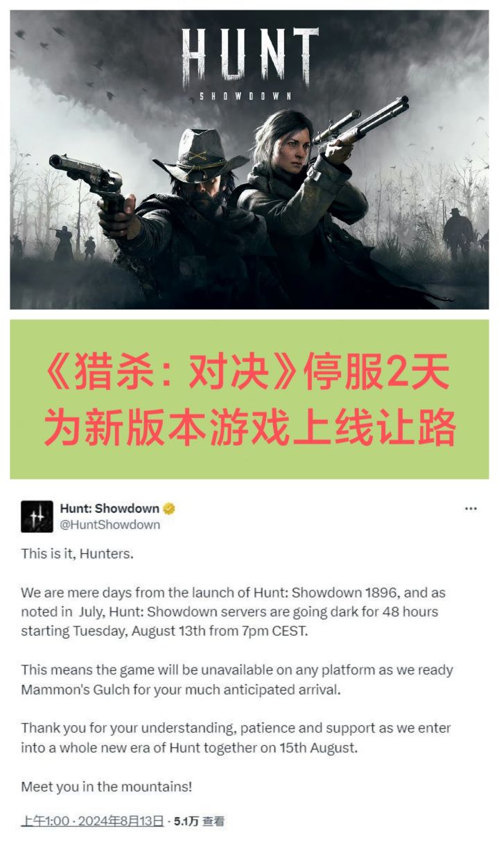 8月13日,《猎杀:对决》官方宣布:服务器预计关闭48小时,为新版本《猎杀:对决1896》上线让路相比于原版游戏,《猎杀:对决1896》升级了引擎,彻底改造了用户界面,对元数据进行了重大更改,并带来了全新地图不知道大家怎么看“停服让路”这事?#今天游戏圈发生了啥 #游戏资讯 #猎杀对决