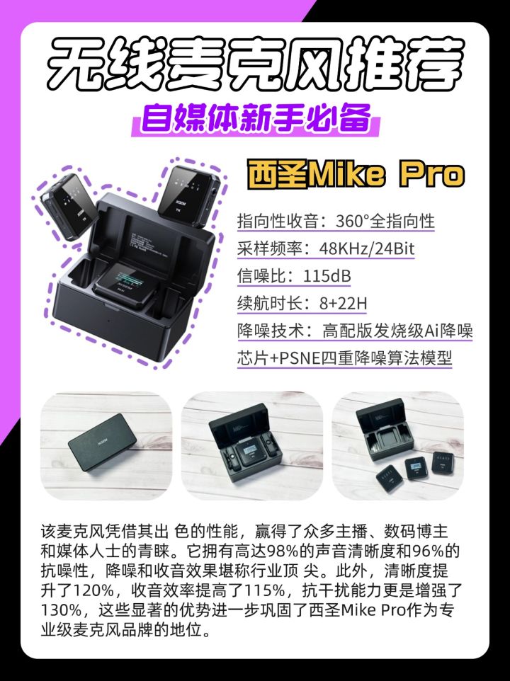 想买无线领夹麦克风还没入手的朋友们千万要听劝!别再不做功课就去买麦克风啦~ 现在网络信息这么发达,网上一搜就是攻略。 为了找到一款性能优越的无线领夹麦克风,我特地整理了一篇攻略出来,避免大家踩坑! 看完这篇攻略可以少走弯路,少花很多冤枉钱~ 大家有需要的可以参考以下这几款: 1.#西圣MikePro 不用说,这款麦克风的性能非常强大,外观设计简洁大方,音质清晰,收音效果极佳,特别适合需要长时间使用