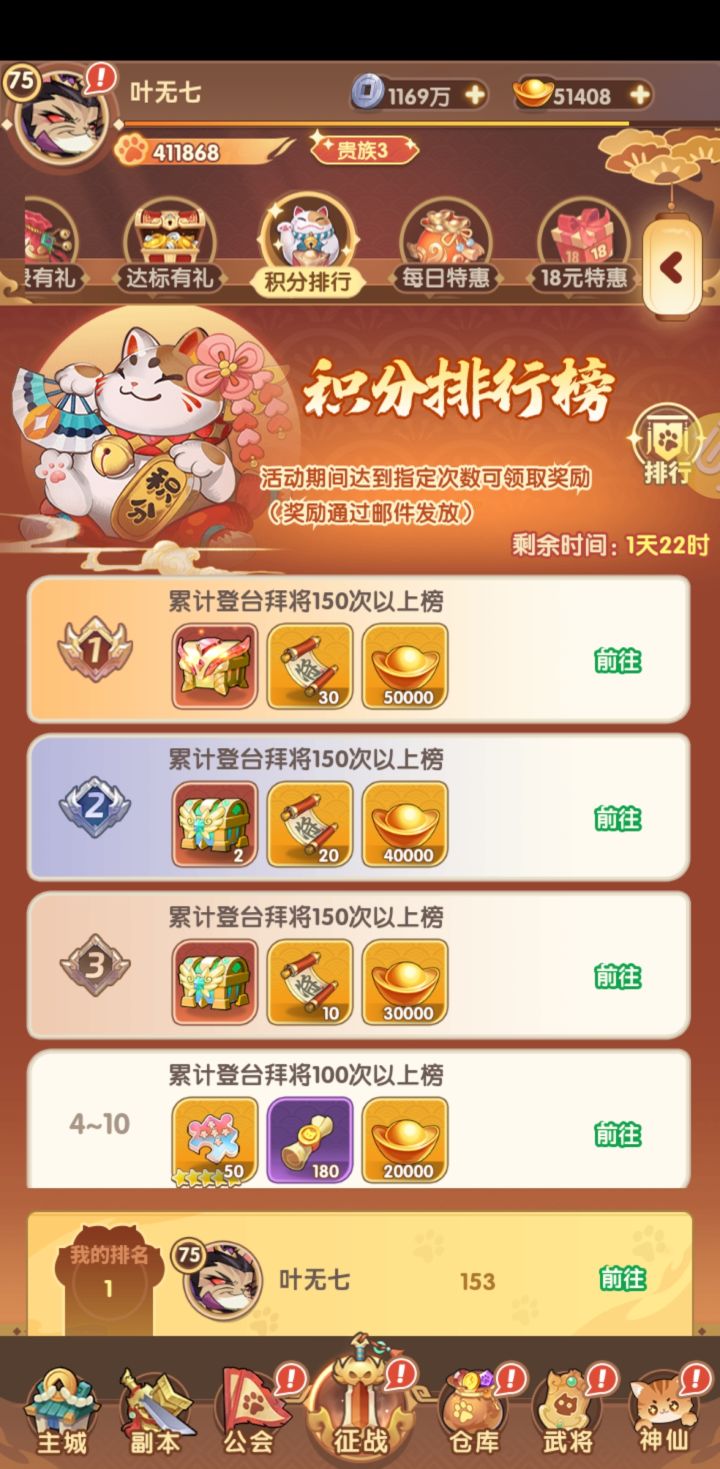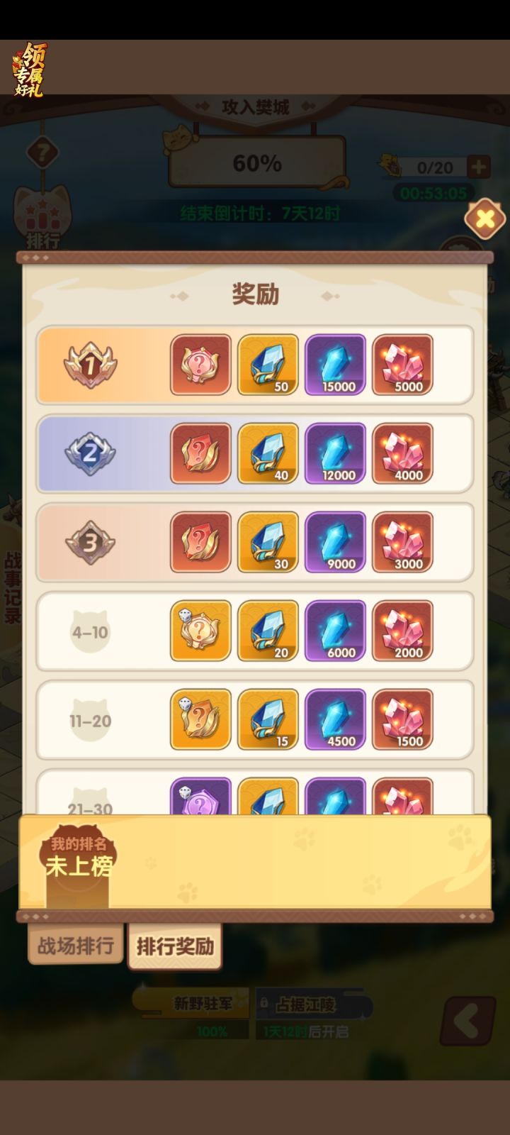 一定要达标200体力拿奖励,普通玩家唯一红佩玉来源。小时回一体力,每天可以4000元宝买20体力,排名奖励前三是红佩玉,第一是职业专属,百分比加成。财神砸蛋活动开始了,尽量达标50发拿元宝,反正这蛋出货率不高,没见过好东西。#猫三国 #猫三国新手养成攻略手册 #游戏攻略