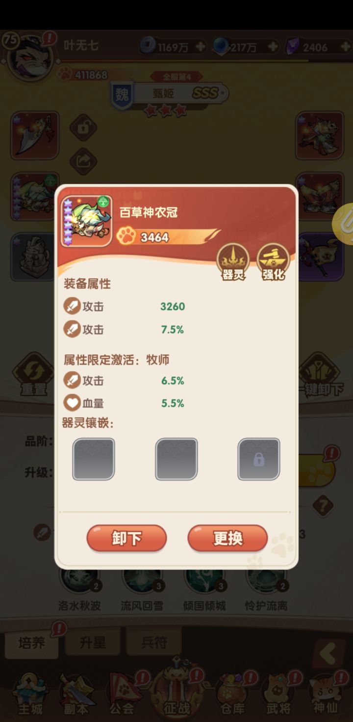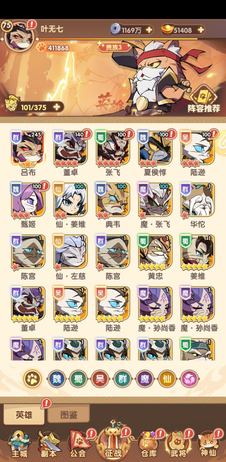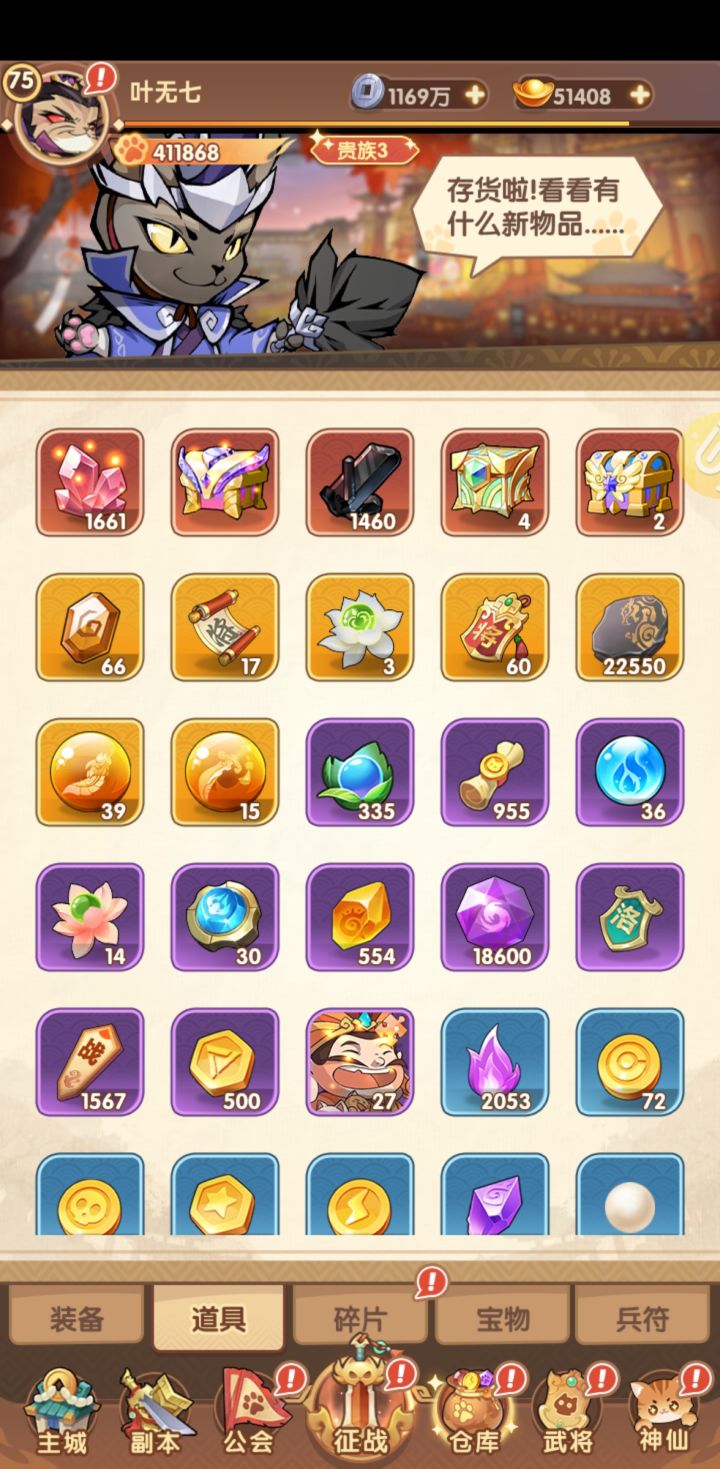 目录:游戏基础玩法开服七天指南游戏活动资源获取与兑换阵容搭配与神将获取及培养充值推荐中期合区指南前言:本人是tap服玩家,266服区,角色ID:不知道改什么。当前版本:9.0(2025.2.13发布)游戏礼包码(包含两个橙色兵符自选):gqkl20242024zqklltgz666dwj666猫三国新版本新手游戏攻略1——游戏基础玩法篇这是一款放置类卡牌游戏,游戏的