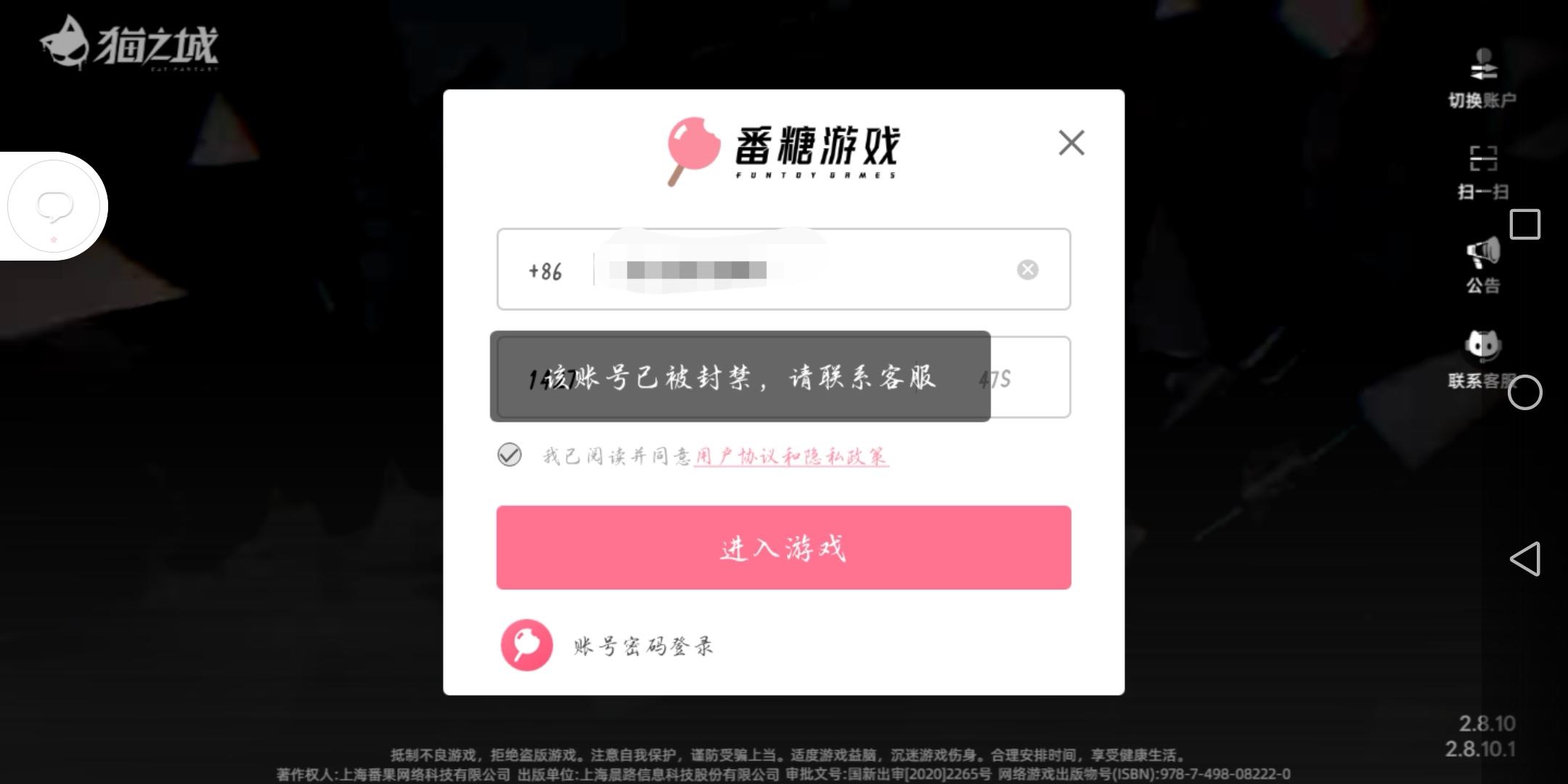 输入我很久之前的账号,结果给我封禁了,点联系客服也点不动,你想干啥[表情_微笑]#猫之城 #猫之城入坑指南