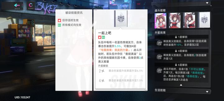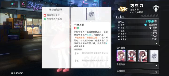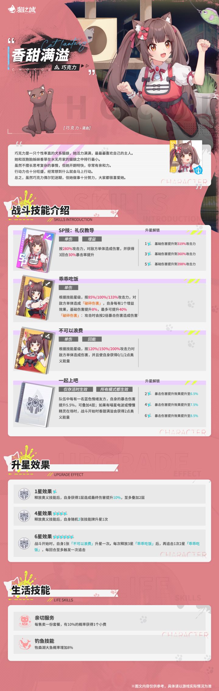 对于这个联动的抽取看法,我个人的想法是不缺石头建议都抽一个,第一因为这是联动不返场,第二这么可爱的猫娘竟然能忍住不抽?说完这些来看看强度方面咋样:巧克力:蓝队单体大c 1星效果, 释放奥义技能后,自身获得1层造成最终伤害提升10%,至多叠加2层 4星效果员 释放奥义技能后,自身随机2张技能牌升星1次 6星效果业双发发 战斗开始时,自身1张「不可以浪费:升星一次。每次释放3星「乖乖吃饭后,再追击1次