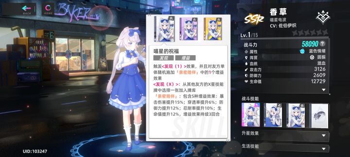 角色定位 水队现有的唯一增益辅助 集发现+增益+驱散+回血为一体的辅助 角色强度 PVE T1水队目前缺少辅助切香草6X战场就能提供BUFF P PVP 在目前互秒的版本纯辅助角色在PVP上并没什么作用 抽取建议 推荐最少抽1只看板因为是联动角色 想要用在PVE推荐6X 角色装备 目前最适合幸运套的角色 可以纯幸运 角色配队 香草+冥卡+丝卡+任意水C 多目标可以带星月夜单目标可以带巧