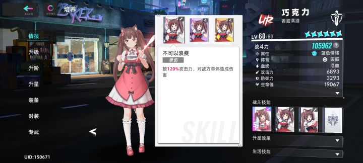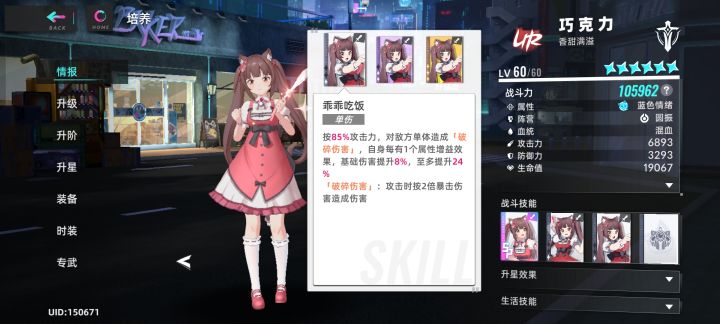 技能 1技能不可以浪费:按1.2倍攻击力对低敌方造成伤害。平平无奇的普通输出技能没有什么太大亮点 2技能乖乖吃饭:按85%攻击力对敌方造成破碎伤害,自身每有一个增益,伤害提升8%,最多叠加三层。非常强烈的对单输出技能,其实增益加伤害的机制导致必须死死绑定香子兰带来的增益效果来增加输出,由于破碎伤害为2倍暴击伤害,所以暴伤提升越高,输出越强,甚至二星吃满buff伤害比大招输出还强,是一个伤害很高