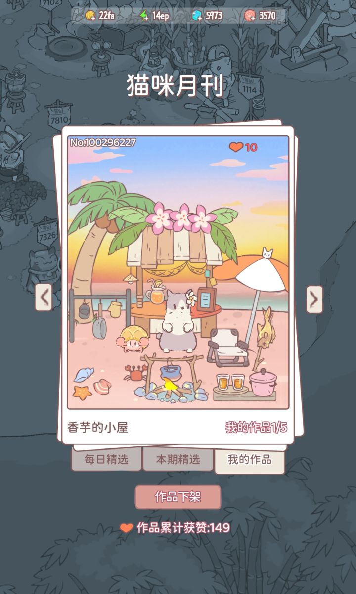 猫咪月刊这里可以把玩家上传的所有作品保留吗?因为都是我花心思设计的,就想偶尔翻出来看看自己的搭配。可是一个月一更新让我没办法看到之前的作品了希望我的作品这里就像本期精选一样,能按照月份收藏。#猫咪和汤主题